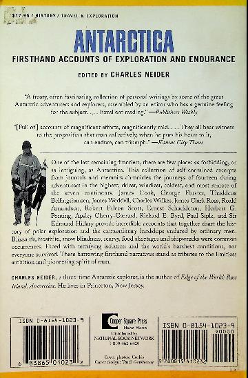 Neider, C.: 2000 USA, softcover, 458 pages. The book Antarctica, Firsthand Accounts of Exploration and Endurance by Charles Neider compiles vivid narratives from explorers who endured extreme conditions on the continent, capturing their personal experiences of survival, discovery, and the harsh polar environment. It offers a literary impression of Antarctica’s heroic age, blending historical accounts with the author’s own insights from his time on the ice. ISBN 9780815410232 In very good condition
