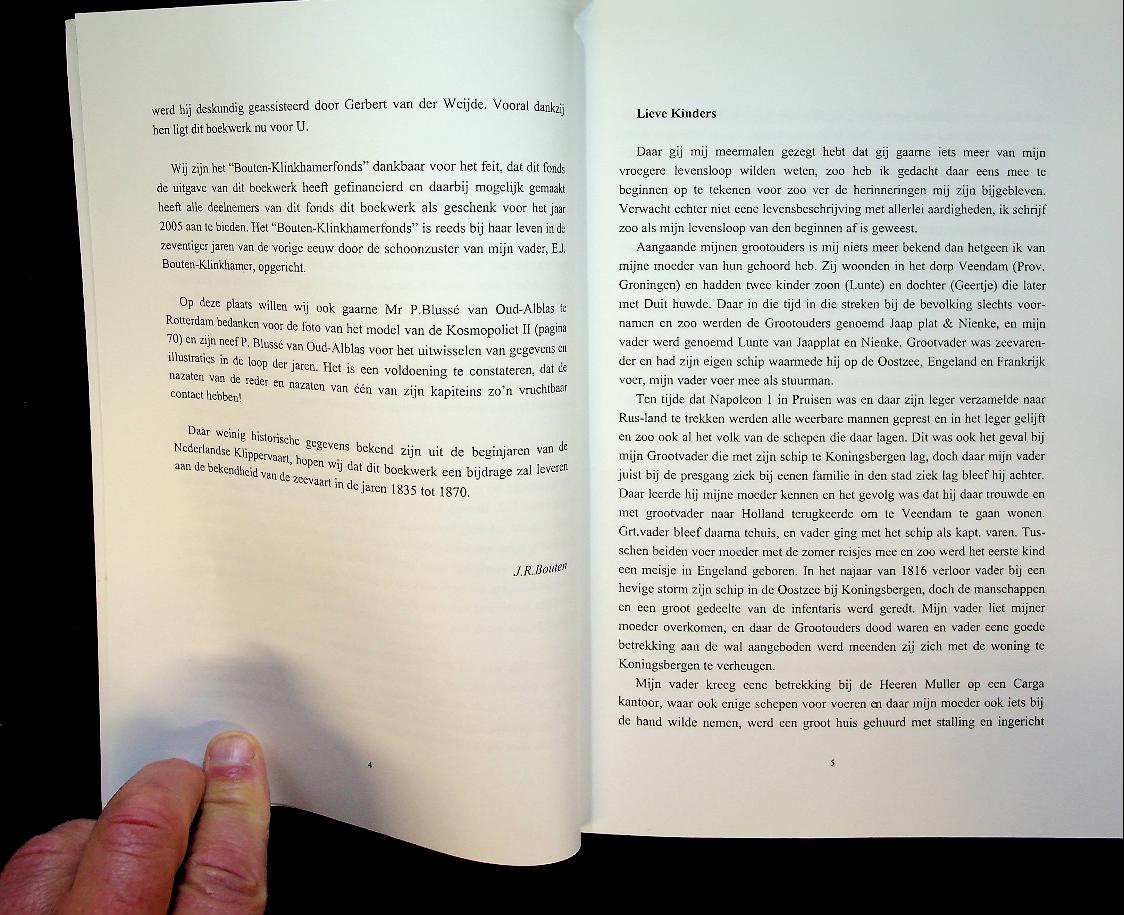 Bouten, Jacob: 2005, softcover, 213 blz., met illustraties. Memoire in de vorm van een verslag aan zijn kinderen, waarin hij terugblikt op zijn loopbaan in de grote zeilvaart in de tweede helft van de 19e eeuw. Het boek schetst in persoonlijke toon het leven aan boord, de zware omstandigheden en de verantwoordelijkheden van een Nederlandse klipperkapitein in de wereldhandel tussen circa 1854 en 1894. ISBN 9789081035514 In zeer goede staat
