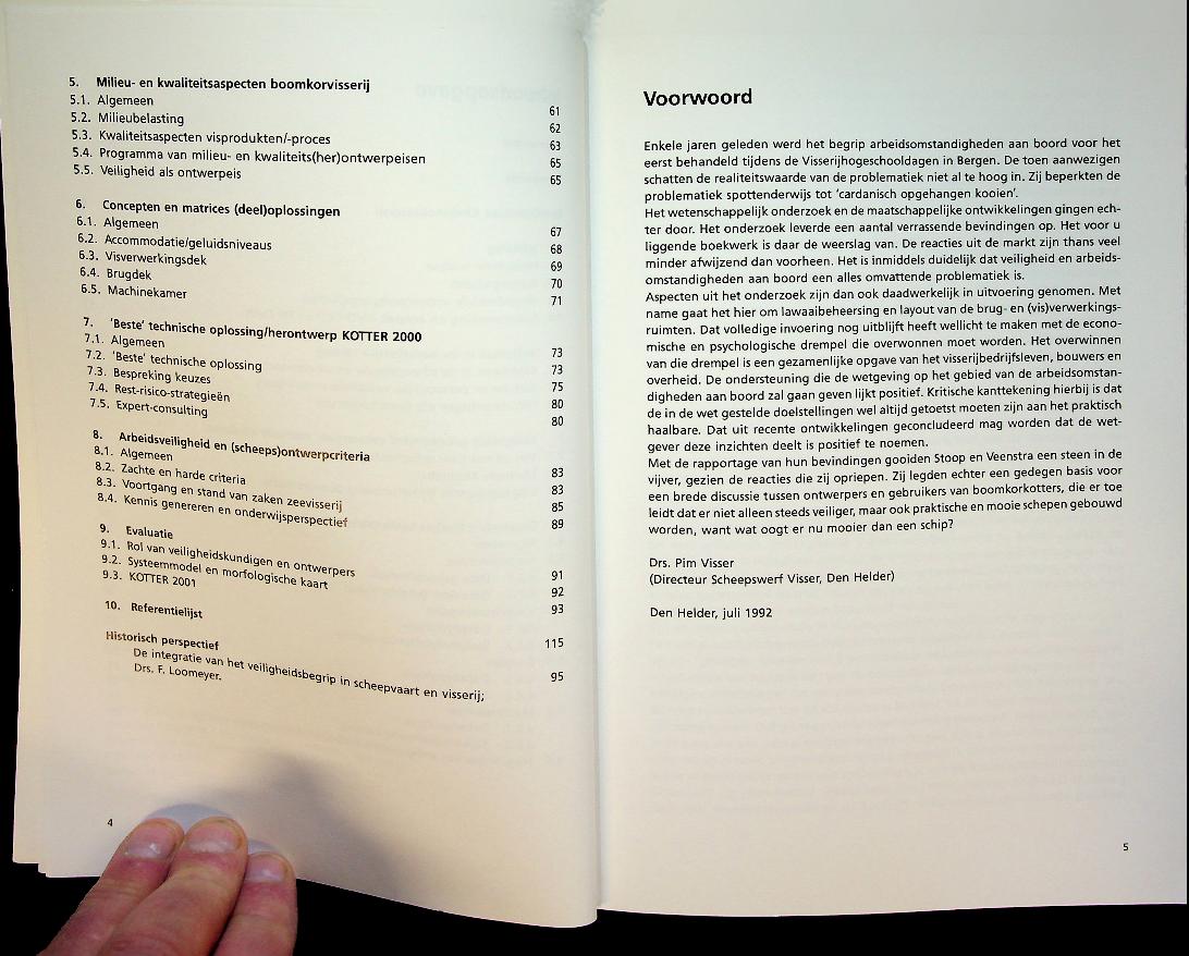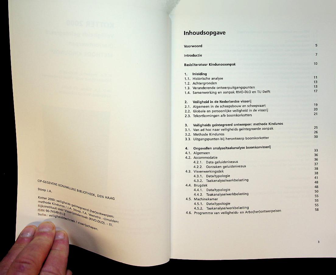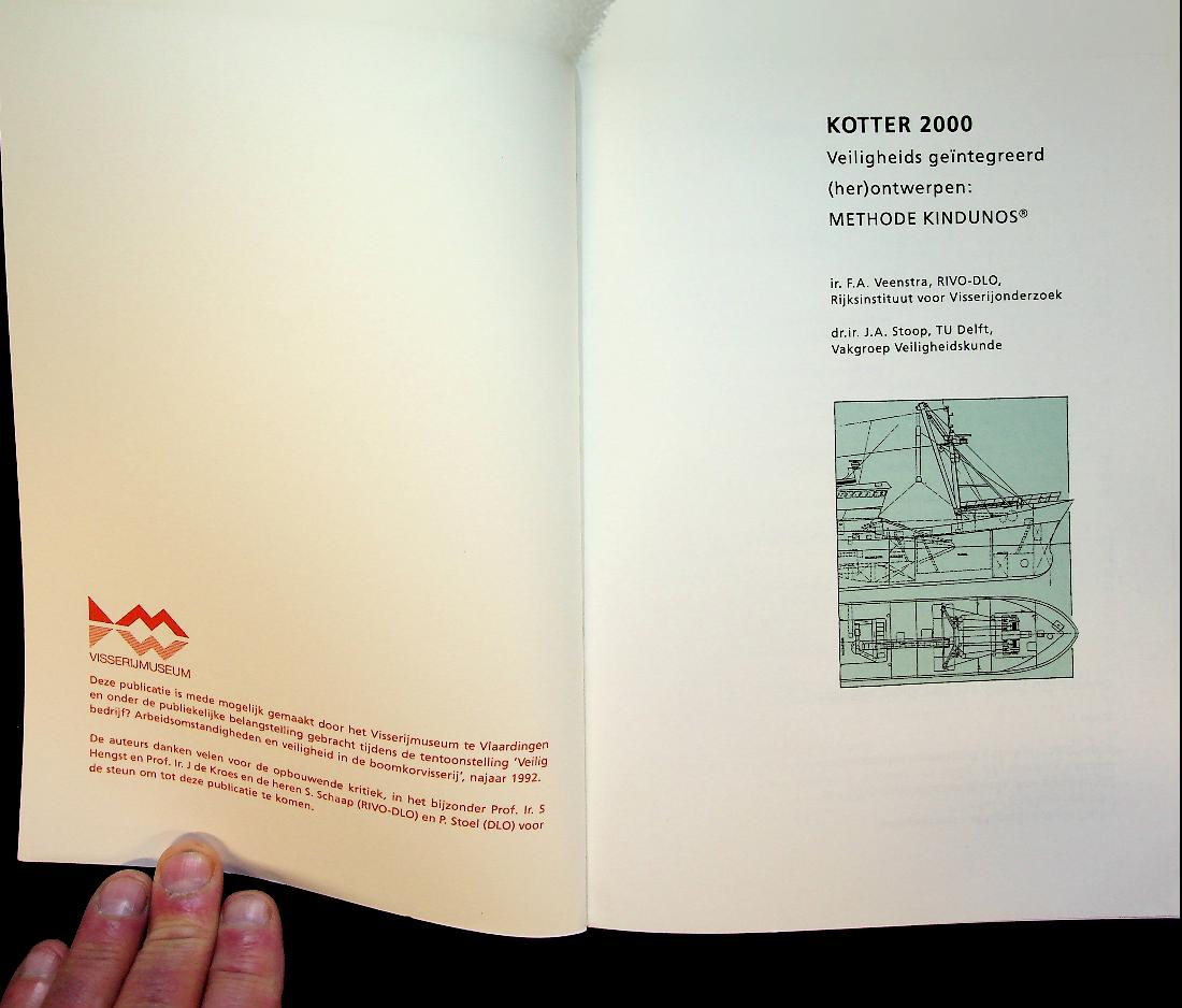Veenstra, F.A. en J.A. Stoop: 2000 RIVO IJmuiden, softcover, 117 blz., geïllustreerd. Methode Kindunos” beschrijft een systematische methode om kotters zodanig (her) te ontwerpen dat veiligheid, arbeidsomstandigheden en milieu integraal worden meegewogen in het ontwerp- en besluitvormingsproces. In zeer goede staat
