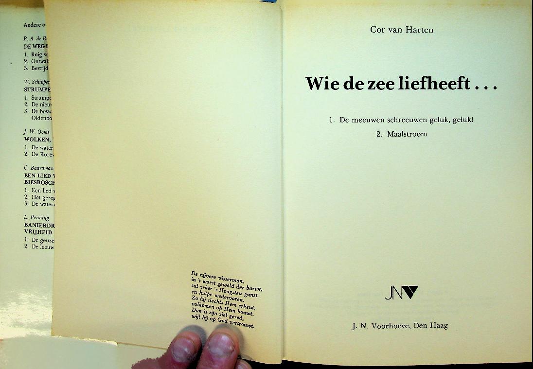 Cor Harten: 1980 Den Haag, hardcover met papieromslag 368 blz.. Met de twee Scheveningse vissersromans De meeuwen schreeuwen geluk, geluk en Maalstroom. Bundel met twee doorleefde vissersverhalen van Cor van Harten, zelf Scheveningse haringvisser, waarin het ruwe bestaan op zee en in het vissersdorp wordt neergezet met oog voor geloof, kameraadschap en risico’s van het vak. ISBN 9789029706612 In zeer goede staat