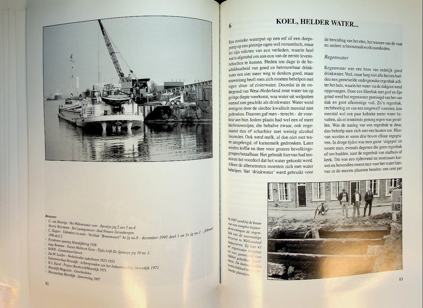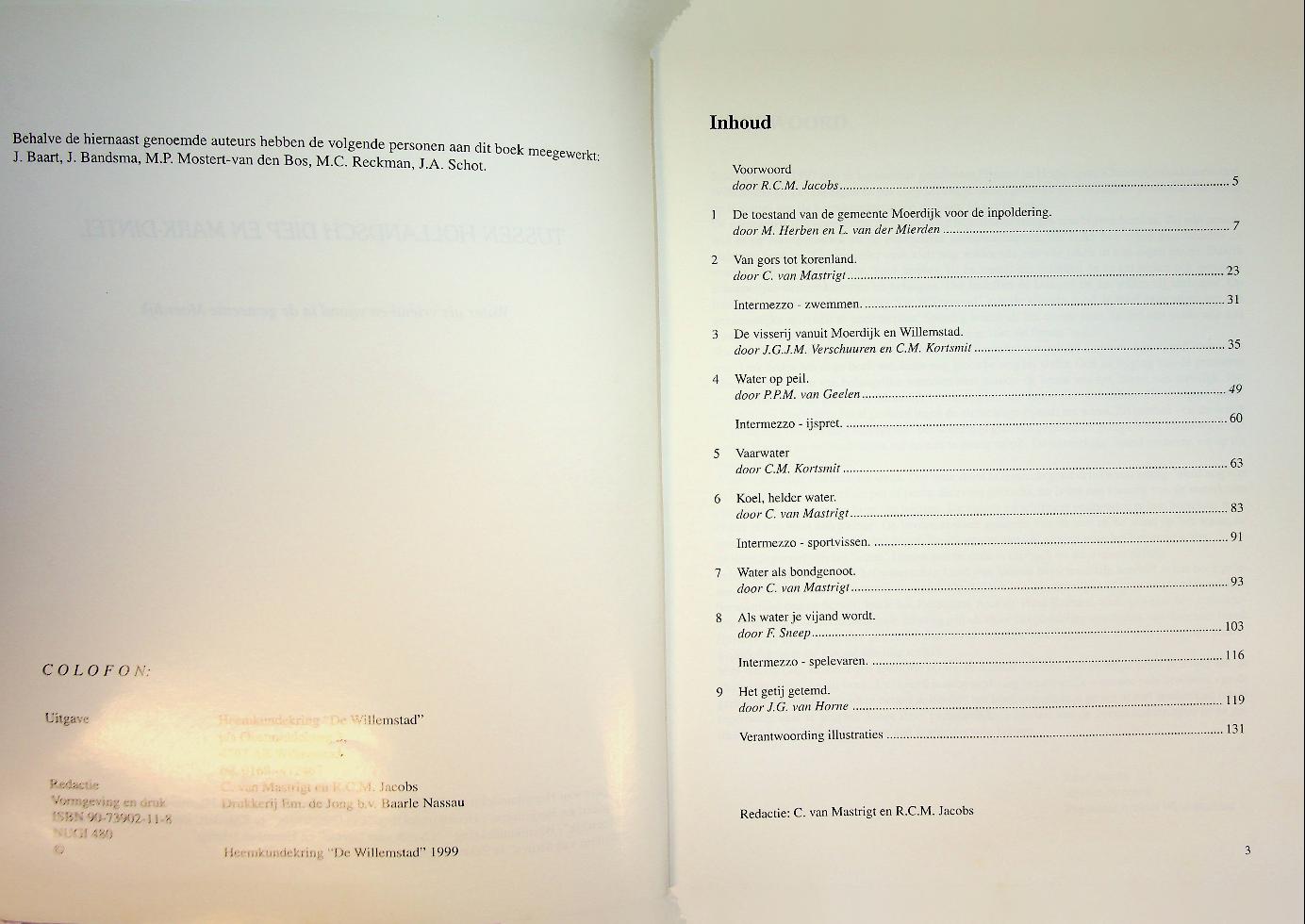 Mastrigt, C. van e.a.: 1999 Willemstad, softcover, 132 blz., geïllustreerd. Het boek beschrijft hoe water als zowel vijand als vriend het leven, de economie en de landschapsontwikkeling in de huidige gemeente Moerdijk tussen Hollandsch Diep, Mark en Dintel eeuwenlang heeft bepaald. Aan de hand van bijdragen van verschillende heemkundekringen en archieven komen thema’s als overstromingen, dijkbouw, visserij, scheepvaart en recreatie in deze regio aan bod. ISBN 9789073902114 In zeer goede staat