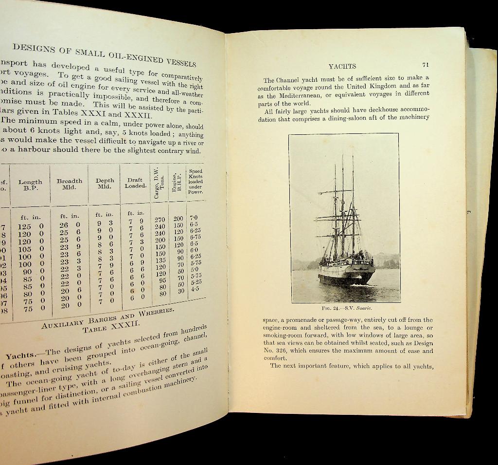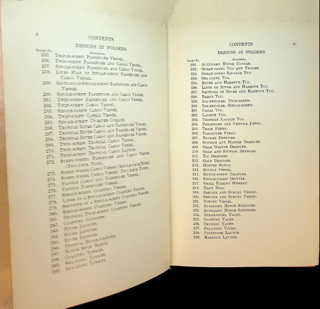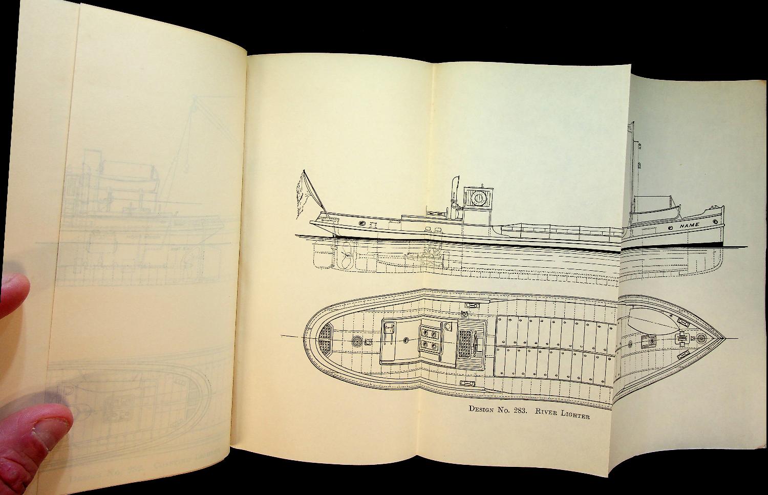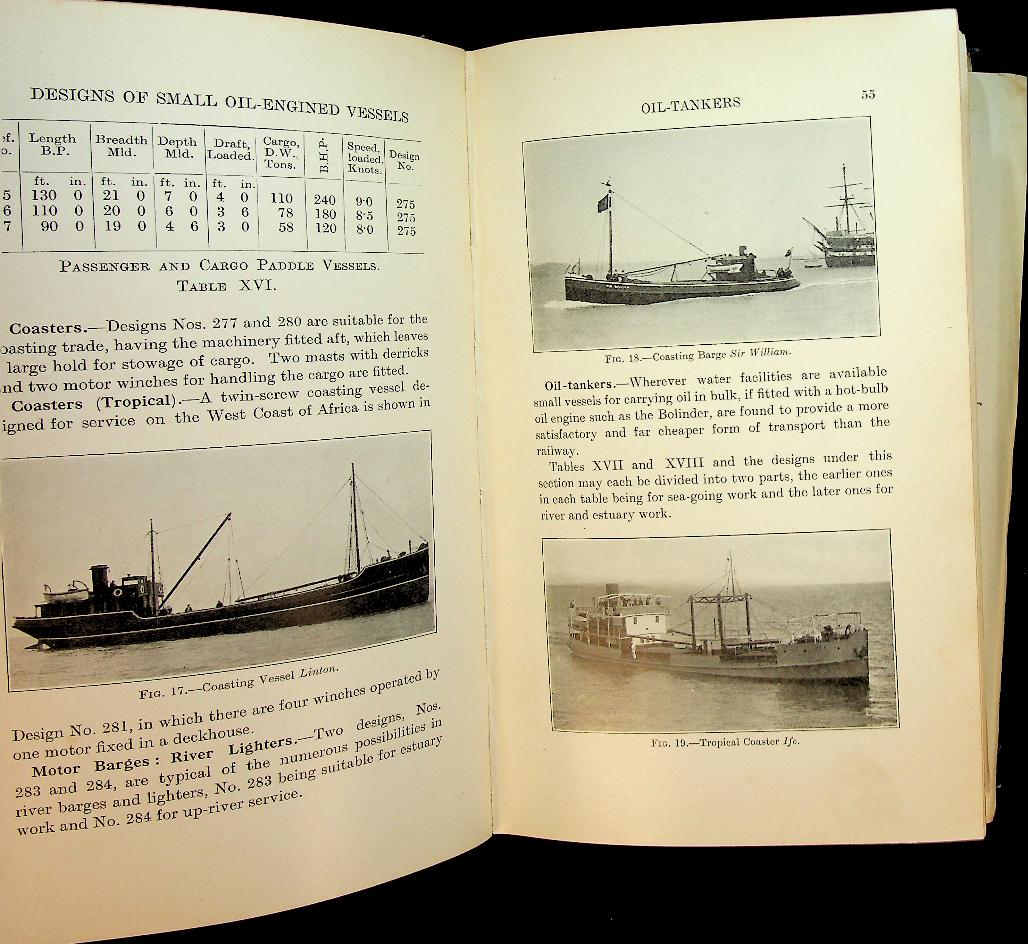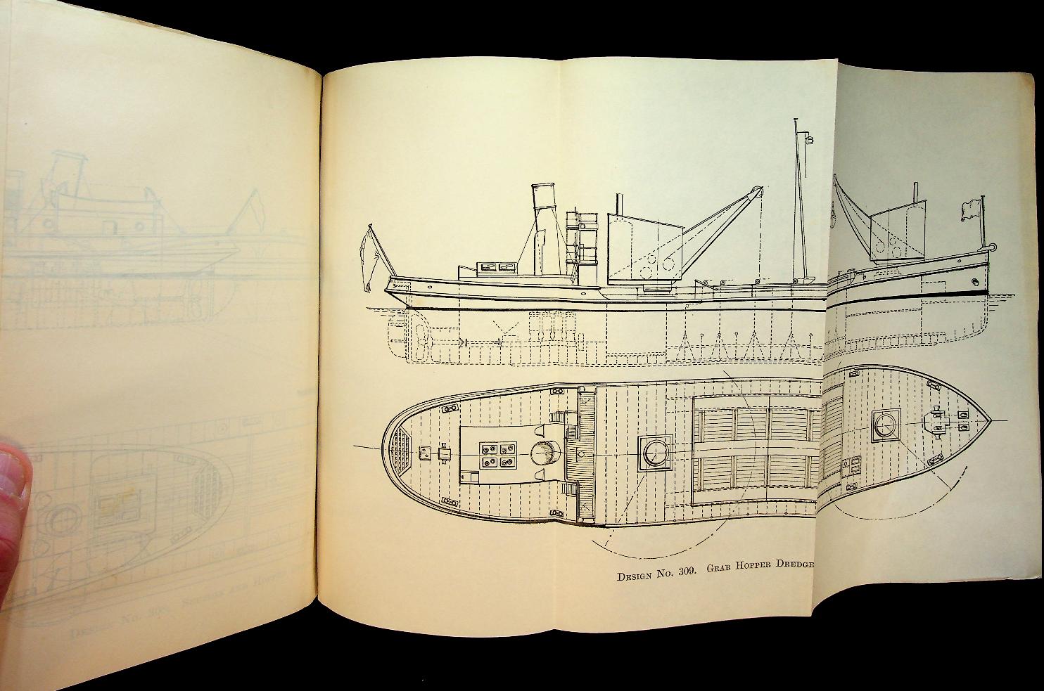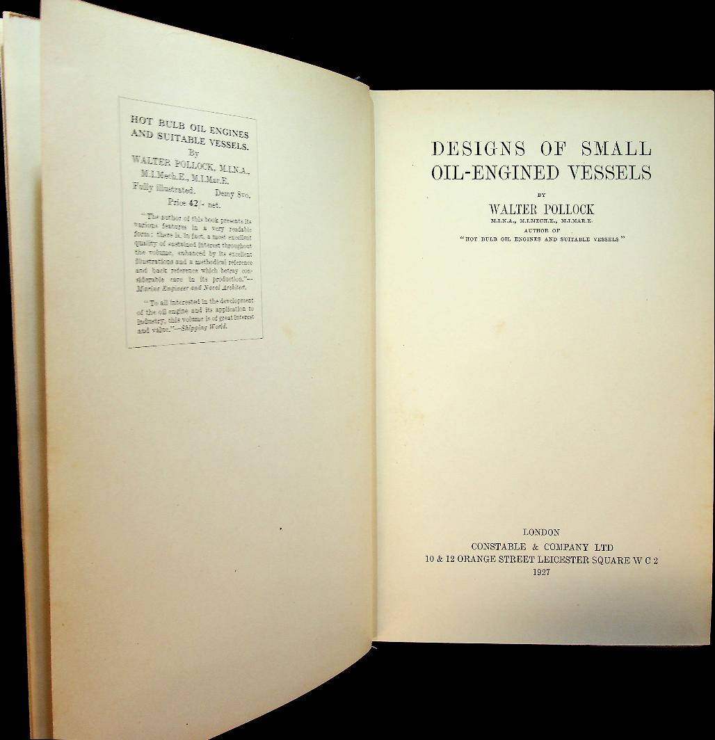 Pollock, Walter: 1927 Constable and Comany Ltd. London, hardcover 81 pages and 95 very detailed folding-out plans of many diverse ships till about 1500 tons. Like Coastal Vessels, trawlers, ice-breakers, tugs, ferrys, cargo vessels. motor schooners, dredgers etc.. “Designs of Small Oil-Engined Vessels” by Walter Pollock presents a collection of 95 detailed pull-out plans and accompanying notes for small commercial and auxiliary vessels powered by early oil engines, aimed at shipowners, builders, and naval architects working in the coastal and inshore trade around the 1920s. The book emphasizes practical hull forms, machinery arrangements, and deck layouts suitable for fishing craft, coasters, and service boats seeking economical operation with internal-combustion propulsion. In very good condition