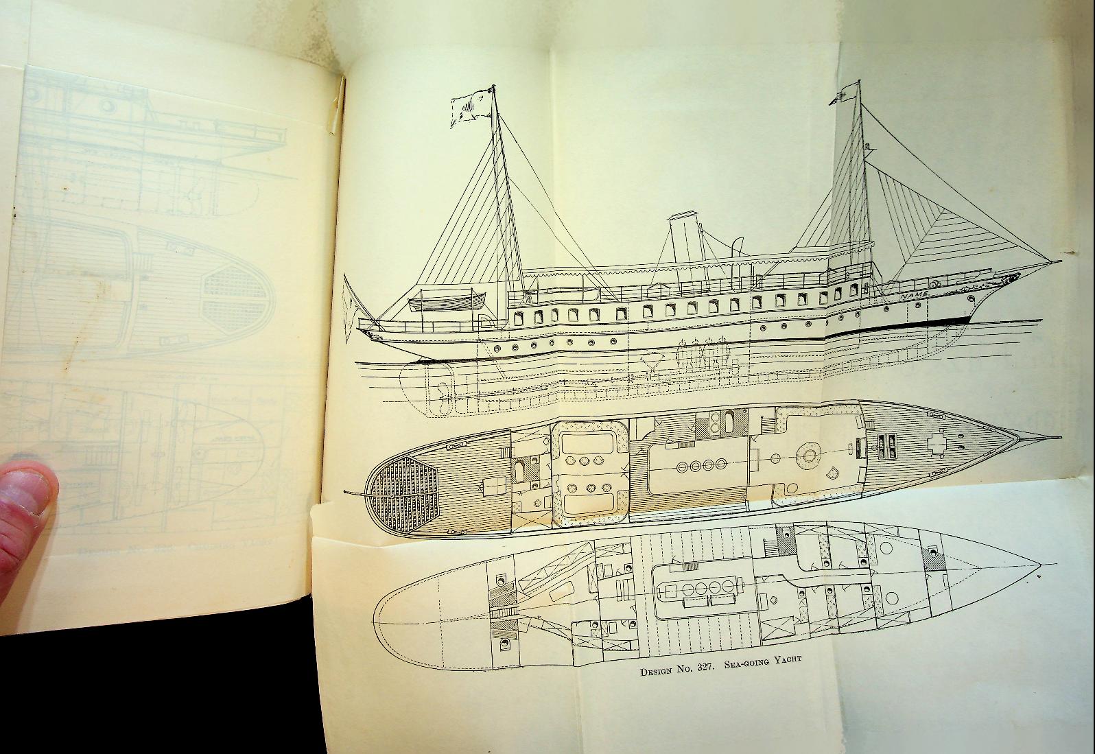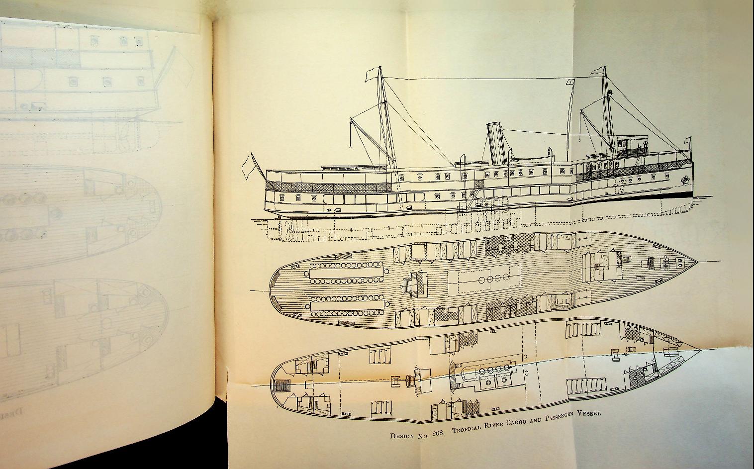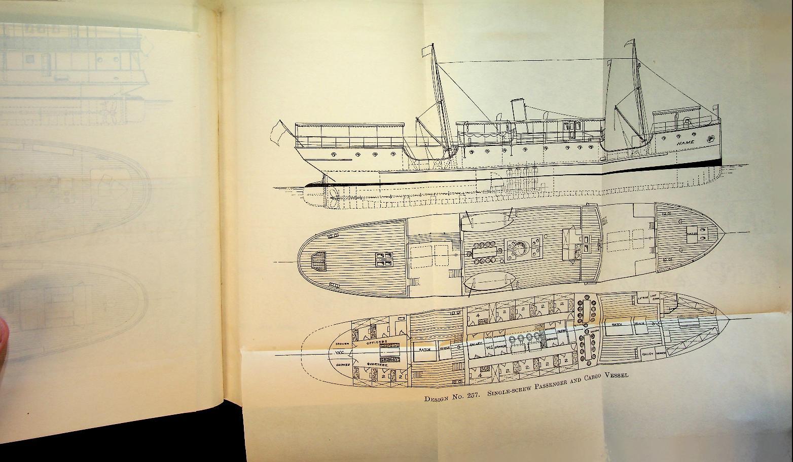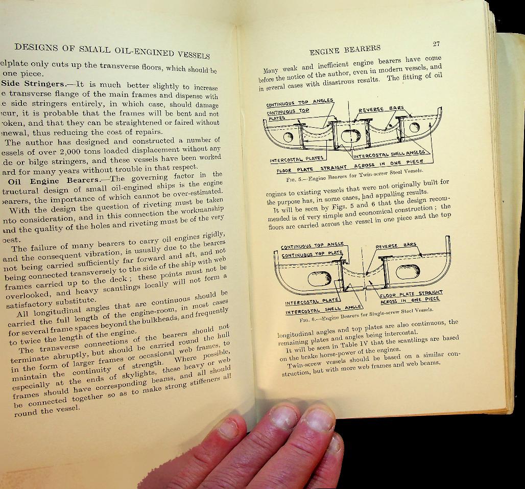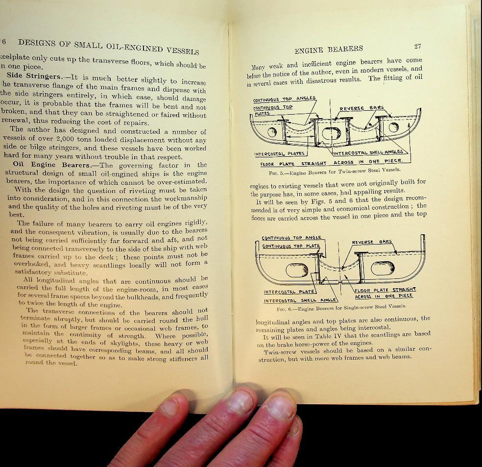 Pollock, Walter: 1927 Constable and Comany Ltd. London, hardcover 81 pages and 95 very detailed folding-out plans of many diverse ships till about 1500 tons. Like Coastal Vessels, trawlers, ice-breakers, tugs, ferrys, cargo vessels. motor schooners, dredgers etc.. “Designs of Small Oil-Engined Vessels” by Walter Pollock presents a collection of 95 detailed pull-out plans and accompanying notes for small commercial and auxiliary vessels powered by early oil engines, aimed at shipowners, builders, and naval architects working in the coastal and inshore trade around the 1920s. The book emphasizes practical hull forms, machinery arrangements, and deck layouts suitable for fishing craft, coasters, and service boats seeking economical operation with internal-combustion propulsion. In very good condition