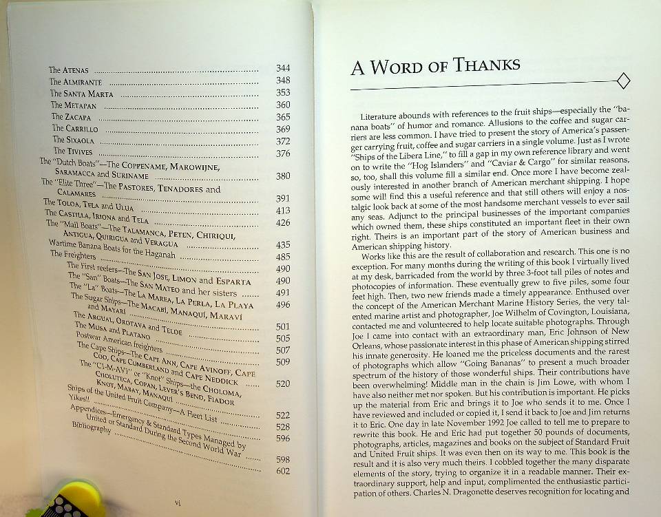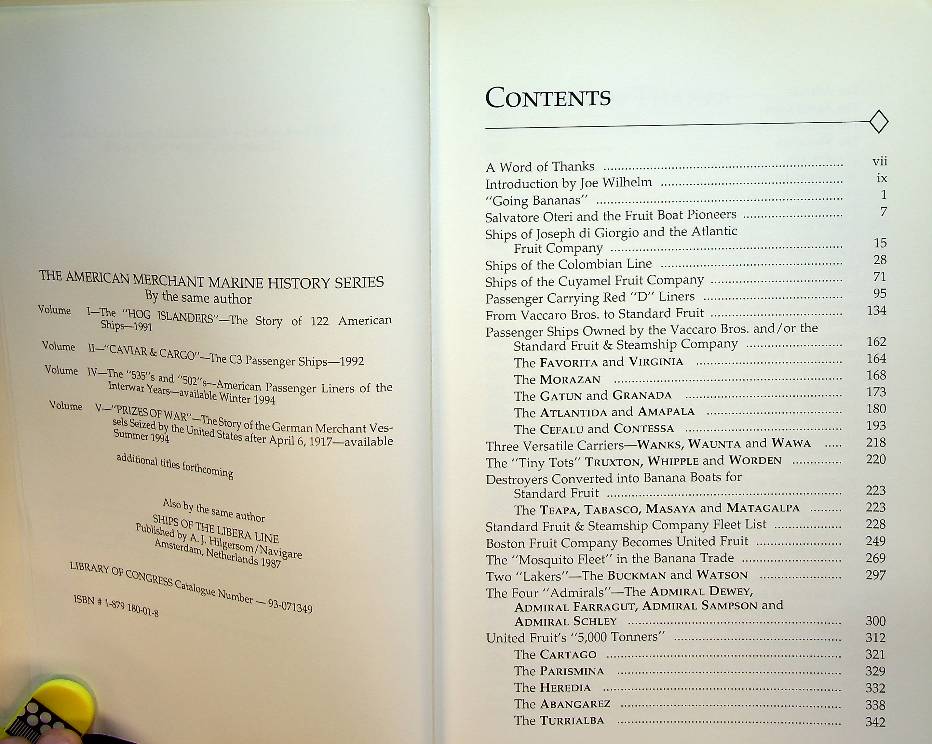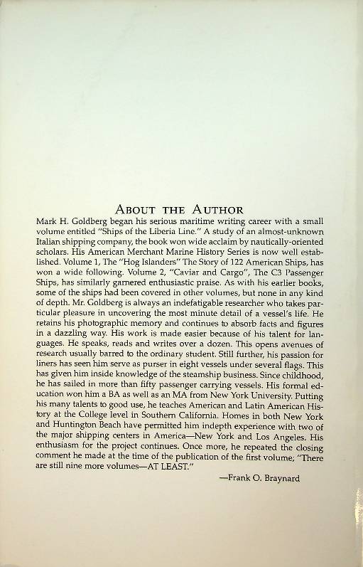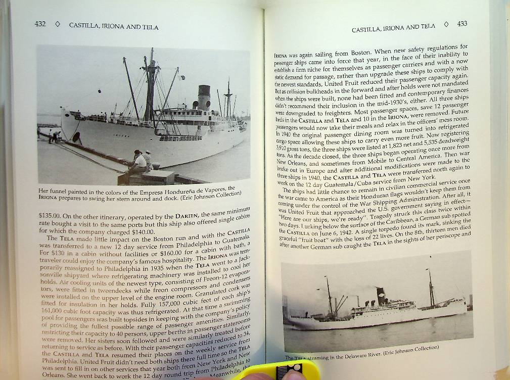Goldberg, Mark H.: I, 1993 New York, softcover 606 pages, with photos and large historical fleet list. American Merchant Marine History Series volume III. Going Bananas: 100 Years of American Fruit Ships in the Caribbean by Mark H. Goldberg is a richly illustrated maritime history of the United Fruit Company’s “Great White Fleet” and other banana carriers, tracing a century of ship design, routes, and operations that connected U.S. ports with Caribbean and Central American plantations. It blends fleet lists, photographs, and wartime episodes, such as losses to U-boats in World War II, with industry lore to document how “banana boats” became synonymous with fast, specialized cargo liners in the region’s trade networks. ISBN 1879180018 In very good condition