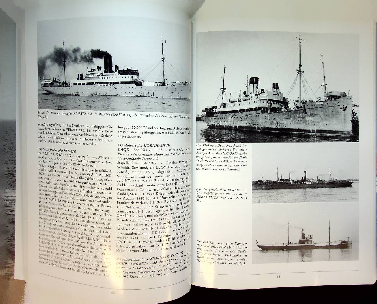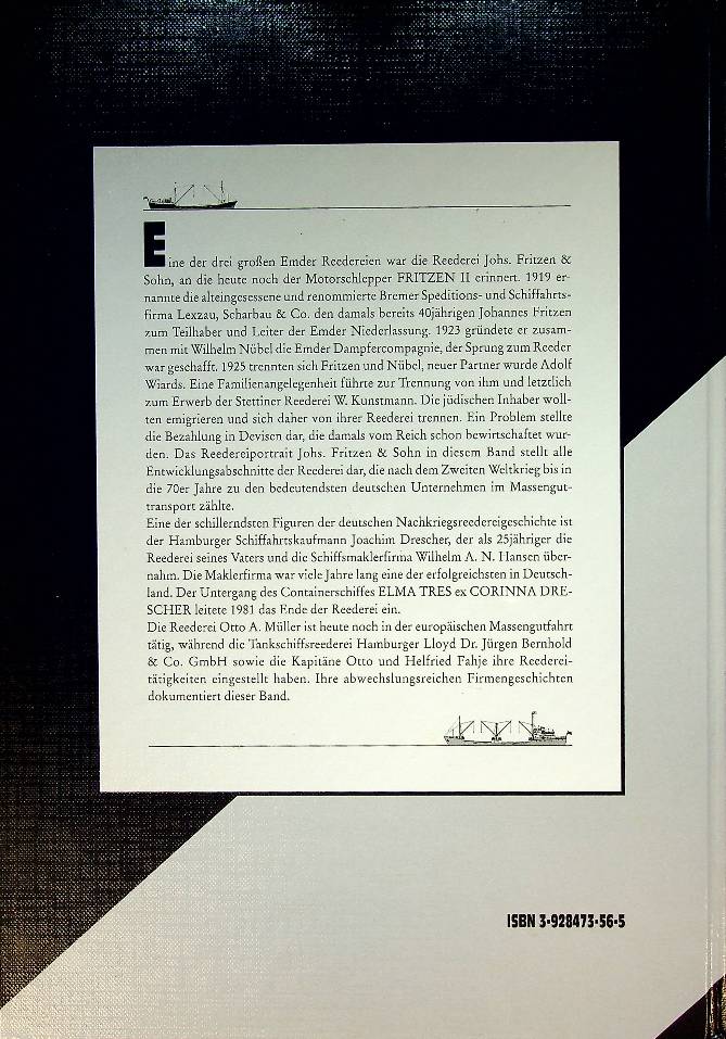 Detlefsen, Gert Uwe: 2000 Bad Segeberg, hardcover 200 blz. Johs. Fritzen and Sohn, Emden / Stettin; Retzlaff-Reederei, Dortmund / Bremen; Otto A. Müller, Hamburg; Reedereien Erich und Joachim Drescher, Hamburg; Hamburger Lloyd Dr. Jürgen Bernhold, Hamburg; Otto und Helfried Fahje, Hamburg. ISBN 9783928473569 / 3928473565 In very good condition