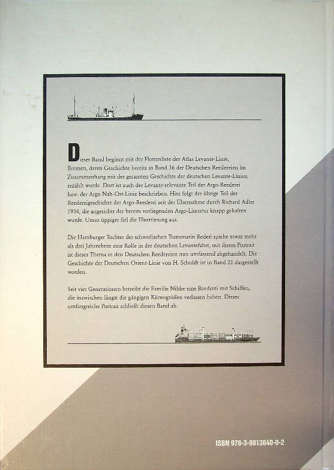 Detlefsen, G.U.: 2010 Segeberg, hardcover 200 pages. Flottenliste der Atlas Levante Linie, Bremen, und Portraits der Argo Reederei Richard Adler und Sohne, Bremen, Transmarin Hamburg GmbH und der Kapitansreeder Heinrich und Reinhold Nibbe. ISBN 9783981364002 In very good condition