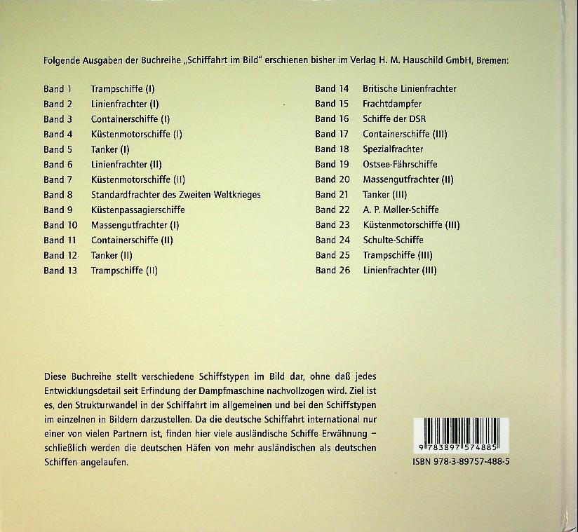 Deltlefsen, G.U.: 2010 Bad Segeberg, hardcover 120 pages. Schiffahrt im Bild, Linienfrachter III rounds off the series on liner freighters with a pictorial survey of later and often more specialized general cargo liners from various shipping companies. Numerous photographs with brief captions highlight ship types, routes and cargo handling, giving a compact visual record of the final generations of traditional liner freighters. ISBN 9783897574885 In very good condition