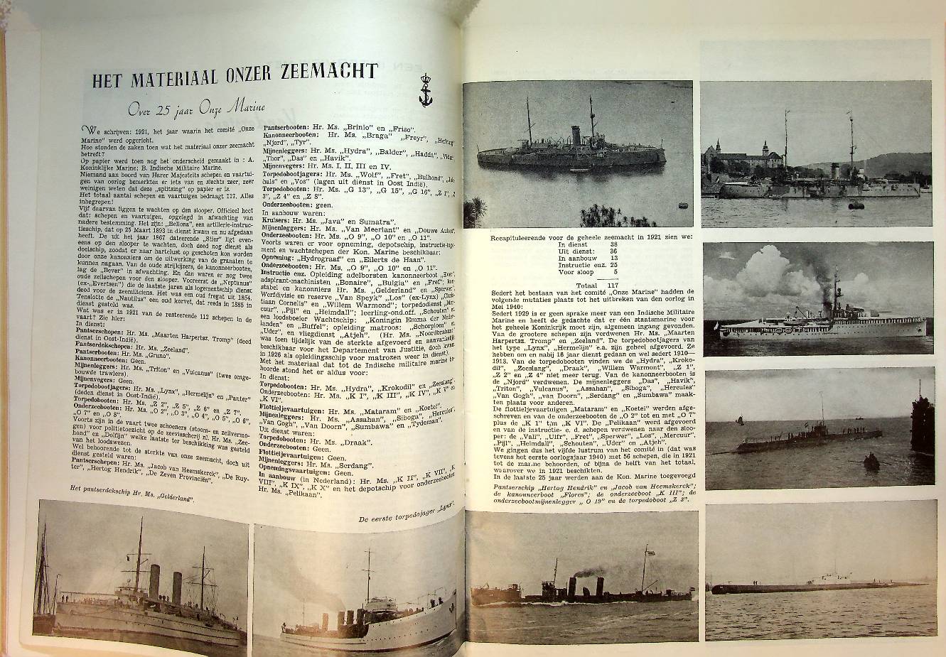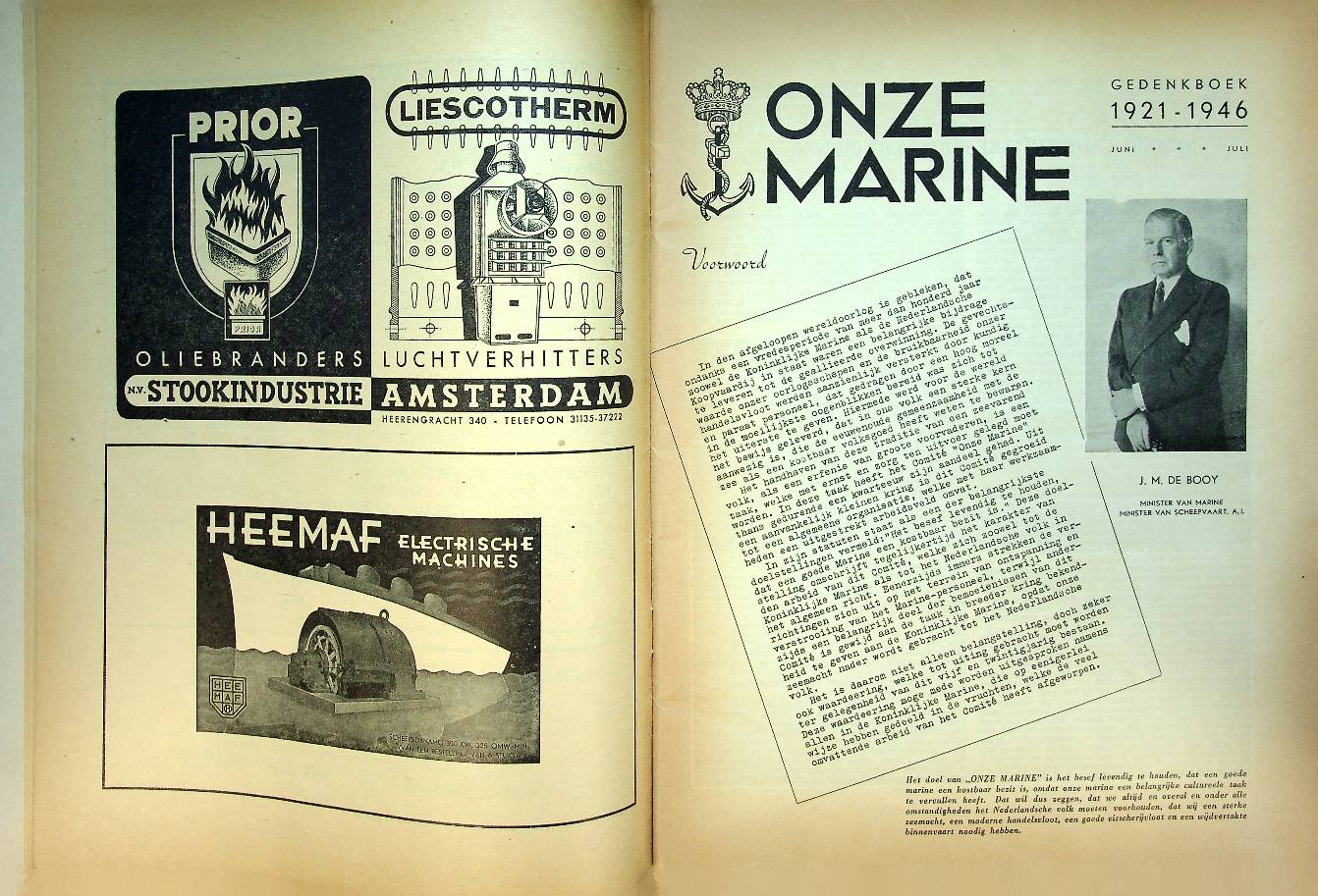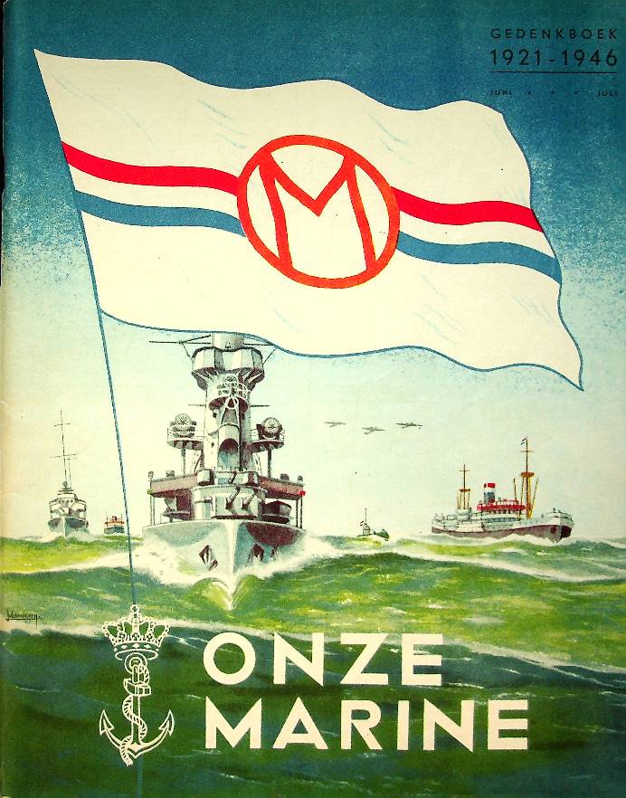 Onze Marine: 1946 s-Gravenhage, softcover 62 blz., met diverse marine onderwerpen. Gedenkboek Onze Marine 1921-1946 is een rijk geïllustreerd herdenkingswerk dat de Koninklijke Marine door de interbellumjaren en de Tweede Wereldoorlog volgt, met nadruk op organisatie, inzet in Europa en de overzeese strijd rond Nederlands-Indië en de Javazee, en de wederopbouw aan het einde van de periode. Het bundelt archiefgestuurde verslagen, lijstwerk en beeldmateriaal over operaties, materieel en personeel, alsmede context bij samenwerking met bondgenoten en naoorlogse doorstart, en dient als monument voor maritieme dienst en offers in 1921-1946. In zeer goede staat. Marine en koopvaardij