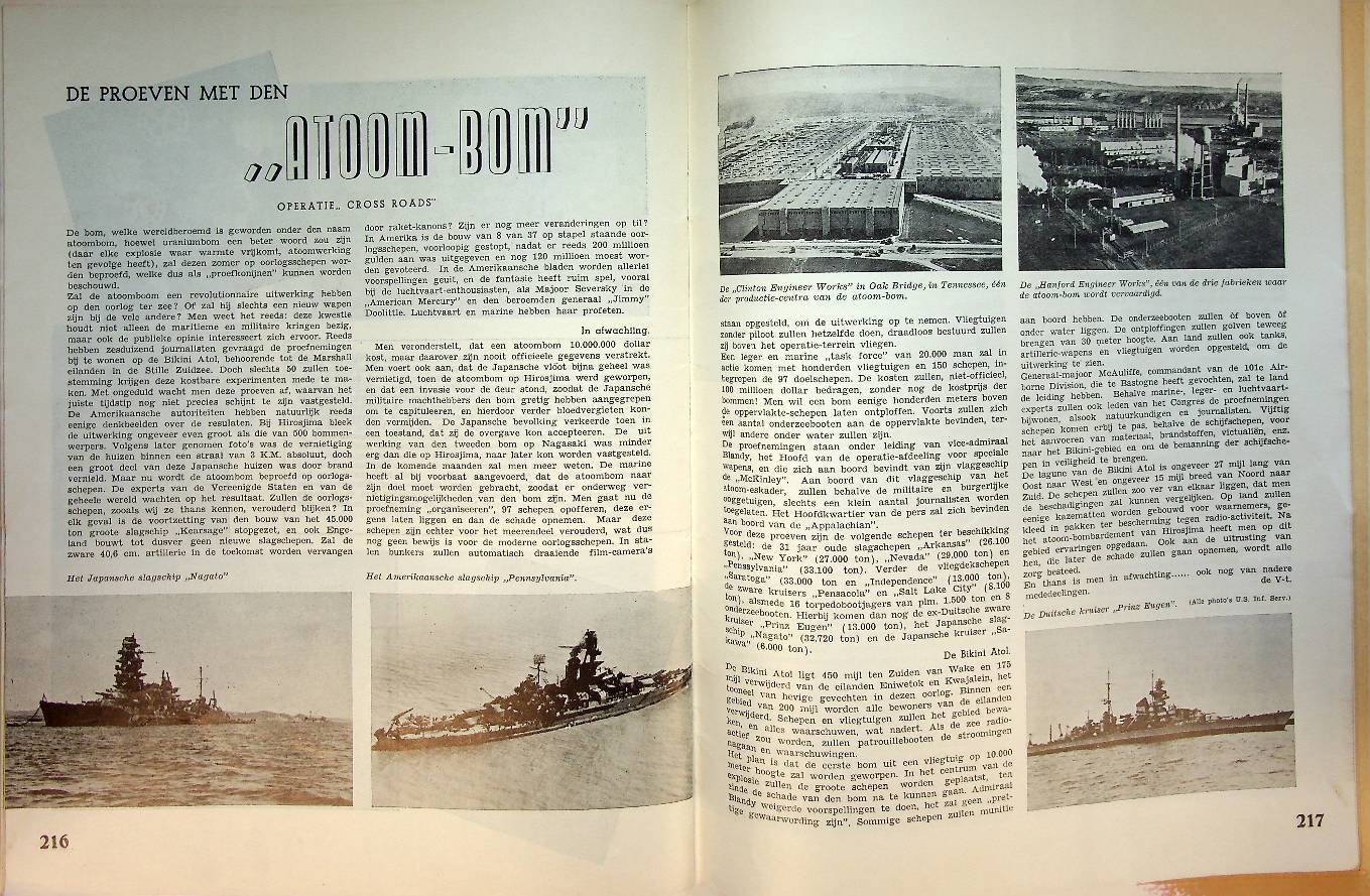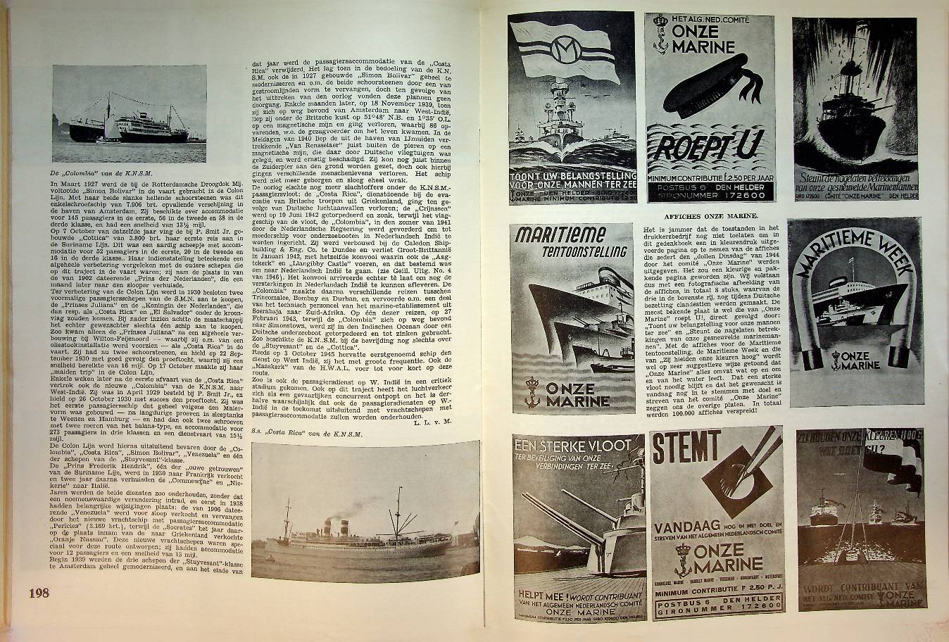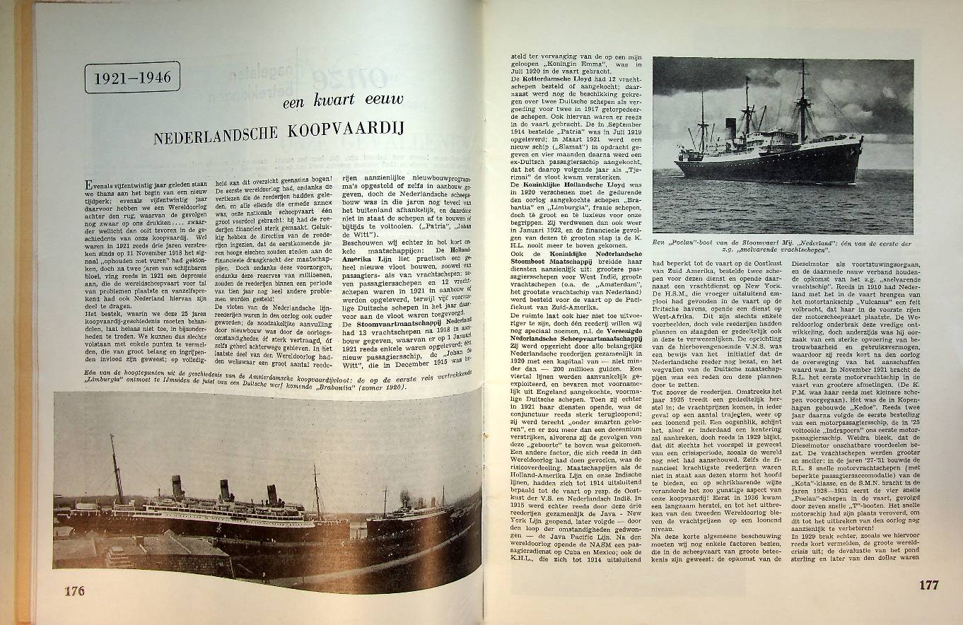 Onze Marine: 1946 s-Gravenhage, softcover 62 blz., met diverse marine onderwerpen. Gedenkboek Onze Marine 1921-1946 is een rijk geïllustreerd herdenkingswerk dat de Koninklijke Marine door de interbellumjaren en de Tweede Wereldoorlog volgt, met nadruk op organisatie, inzet in Europa en de overzeese strijd rond Nederlands-Indië en de Javazee, en de wederopbouw aan het einde van de periode. Het bundelt archiefgestuurde verslagen, lijstwerk en beeldmateriaal over operaties, materieel en personeel, alsmede context bij samenwerking met bondgenoten en naoorlogse doorstart, en dient als monument voor maritieme dienst en offers in 1921-1946. In zeer goede staat. Marine en koopvaardij
