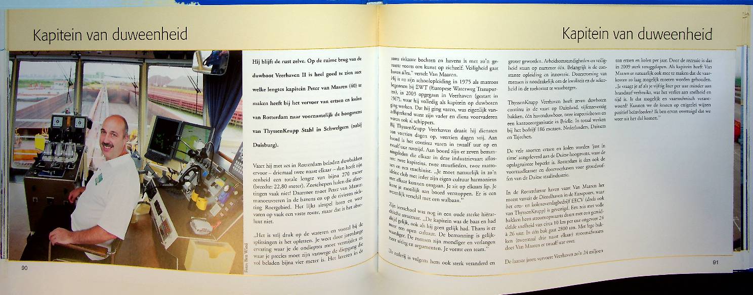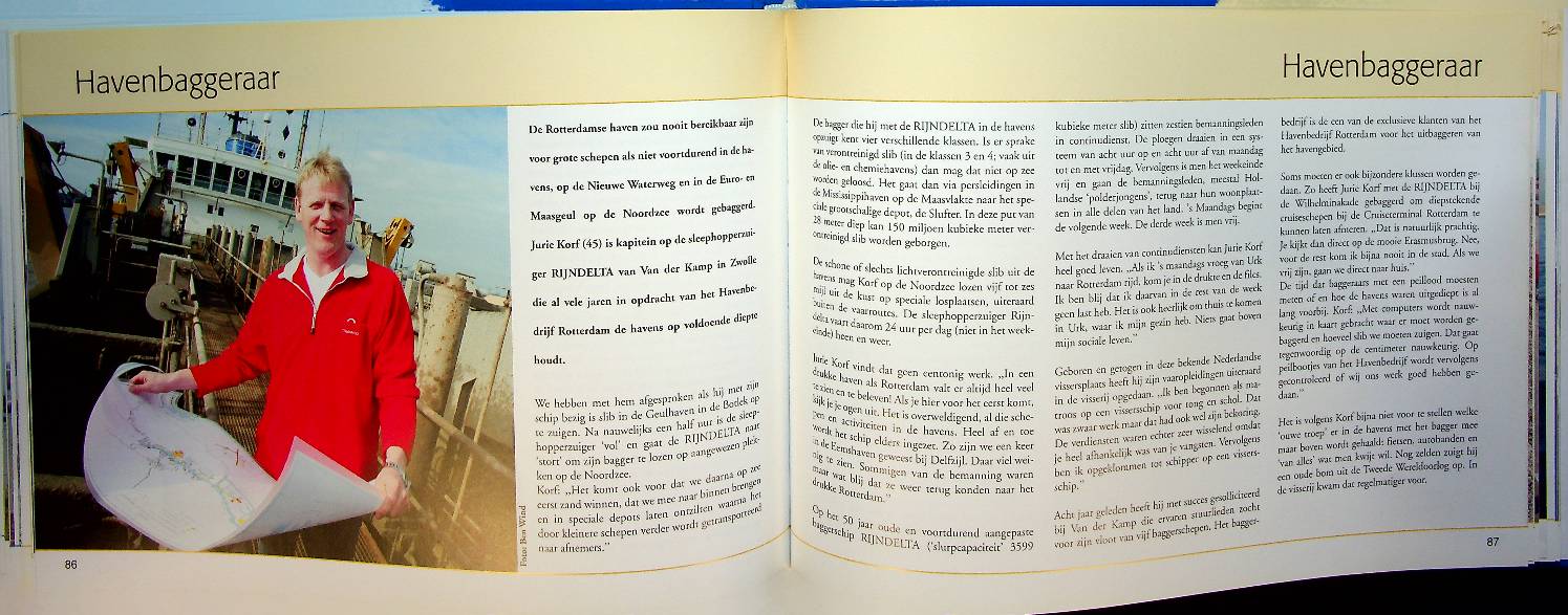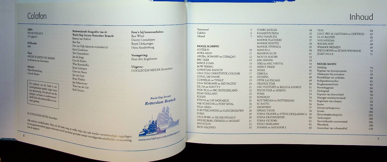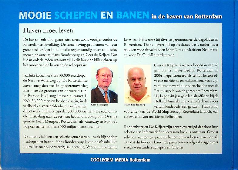 Roodenburg, H en Keijzer, C. de: hardcover 112 blz. Mooie schepen en banen in de haven van Rotterdam deel 1 van Hans Roodenburg en Cees de Keijzer is het eerste deel in de bekende Rotterdamse havenreeks, een gebonden fotoboek met korte, informatieve teksten bij de foto’s. Het boek toont een selectie van bijzondere schepen (op alfabetische volgorde met basisgegevens) én een reeks typische havenbanen, met als doel het mooie en vaak onbekende werk in de Rotterdamse haven toegankelijk te maken voor een breed publiek. ISBN 978907352924 In zeer goede staat