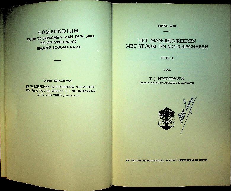 Noordraven, T.J.: 1933, hardcover, 50 en 101 blz., geïllustreerd. Het boek “Het Manoeuvreeren met Stoom- en Motorschepen” van Noordraven biedt een praktische handleiding voor het veilig en efficiënt behandelen van stoom- en motorschepen, met nadruk op schroefwerking, roerwerking, draaipunt, wind- en stroominvloeden, en aan- en afmeren in krappe havens. Het combineert beknopte theorie over krachten en hydrodynamica met toegepaste manoeuvres zoals keren, stoppen, zijwaarts verplaatsen en het corrigeren van schroefeffecten voor verschillende scheepstypen en machine-indelingen. In zeer goede staat