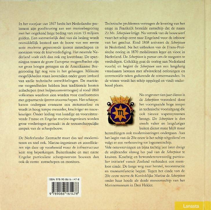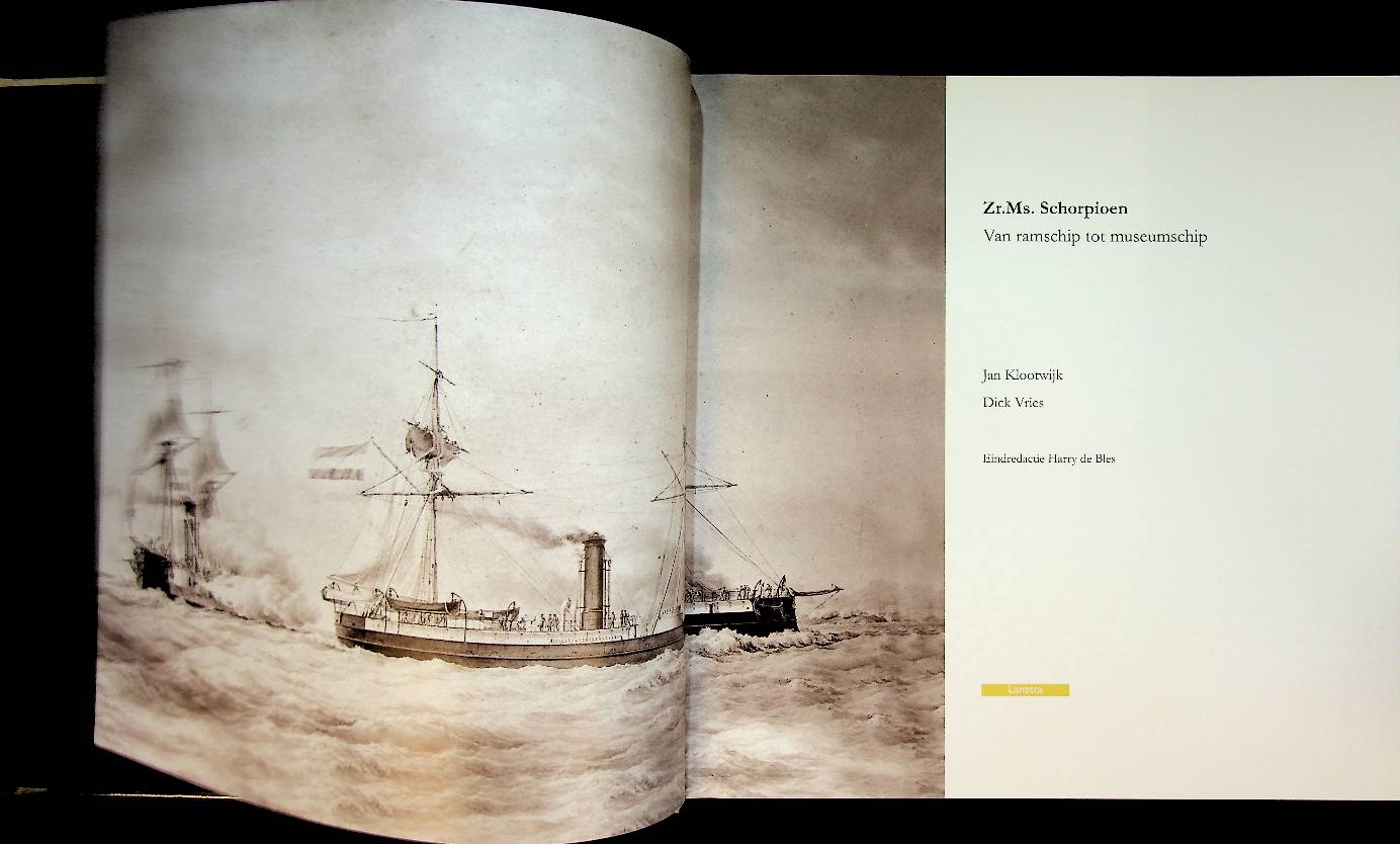 Klootwijk, Jan en Dick Vries: Lanasta Emmen hardcover 144 blz., rijk geïllustreerd. Zr.Ms. Schorpioen. Van ramschip tot museumschip beschrijft de levensloop van het 19e‑eeuwse ramschip Schorpioen, van de bouw in het buitenland en inzet als oorlogsschip tot de latere rol als logements‑ en uiteindelijk museumschip in Den Helder. Het boek gaat in op techniek, verbouwingen, bijna-sloop en de redding door particuliere initiatieven, rijk geïllustreerd met historische en recente foto’s. ISBN 9789086161478 In zeer goede staat