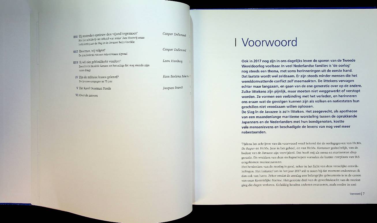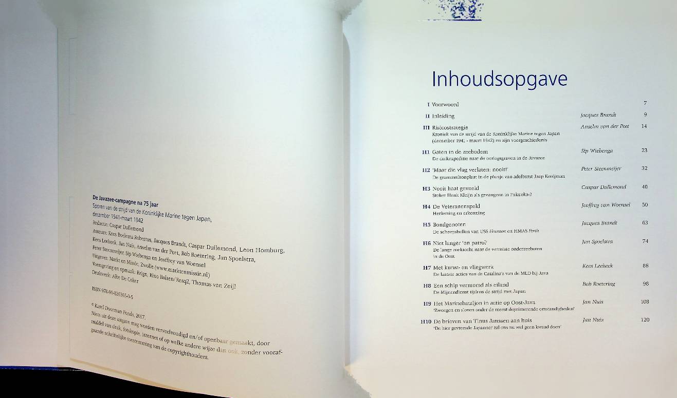 Dullemond, C: 2017, hardcover 172 blz., met foto's. De Javazee-campagne na 75 jaar schetst aan de hand van archeologisch en historisch onderzoek de strijd van de Koninklijke Marine tegen de Japanse marine in Nederlands-Indië tussen december 1941 en maart 1942, met bijzondere aandacht voor de Slag in de Javazee en het lot van de Nederlandse schepen en bemanningen. Het boek laat zien welke sporen deze gevechten op de zeebodem en in het collectieve geheugen hebben achtergelaten en werpt nieuw licht op de betekenis van deze campagne voor de Nederlandse maritieme geschiedenis. ISBN 9789082636505 In zeer goede staat