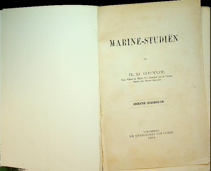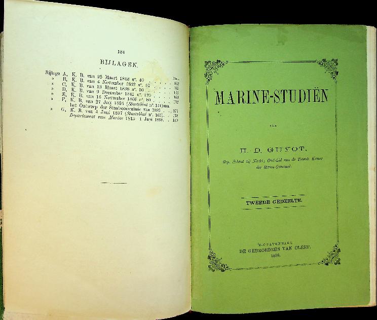 Guyot, H.D.: 1898 van Cleef 's-Gravenhage, hardcover (2 delen nieuw ingebonden) samen 294 blz. Dit tweedelige werk onderzoekt in detail de organisatie, taken en technische ontwikkeling van de Nederlandse marine in de late 19e eeuw, met veel aandacht voor vlootsamenstelling, verdediging en maritieme strategie. Tegelijkertijd bevat het beschouwende essays waarin Guyot de rol van de marine voor de nationale veiligheid en koloniale belangen analyseert en voorstellen doet voor modernisering van vloot en verdediging. In zeer goede staat