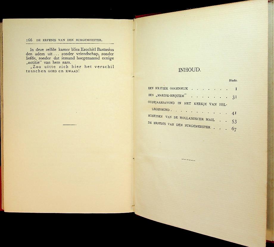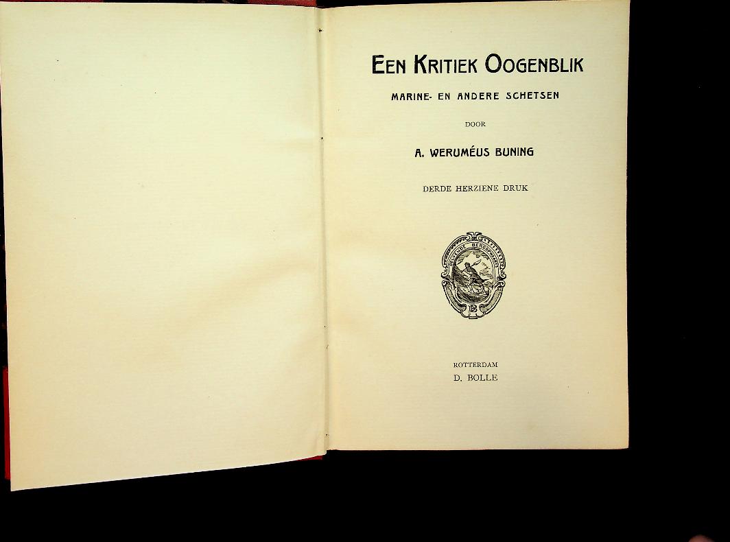 Werumeus Buning, A: Bolle, ca.1910 Rotterdam, hardcover, 166 blz.. Een kritiek oogenblik is een bundel korte, realistisch geschreven (marine-)schetsen waarin A. Werumeus Buning het leven en de spanning aan boord van marineschepen — en daarnaast enkele “andere” scènes buiten de marine — in losse, zelfstandig leesbare stukken neerzet. Het draait minder om één doorlopend verhaal dan om sfeer, karaktertekening en momenten waarop een situatie “kantelt” en iemands keuzes of plichtsbesef op de proef worden gesteld. In zeer goede staat