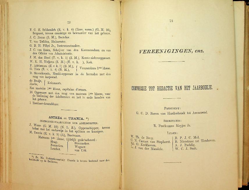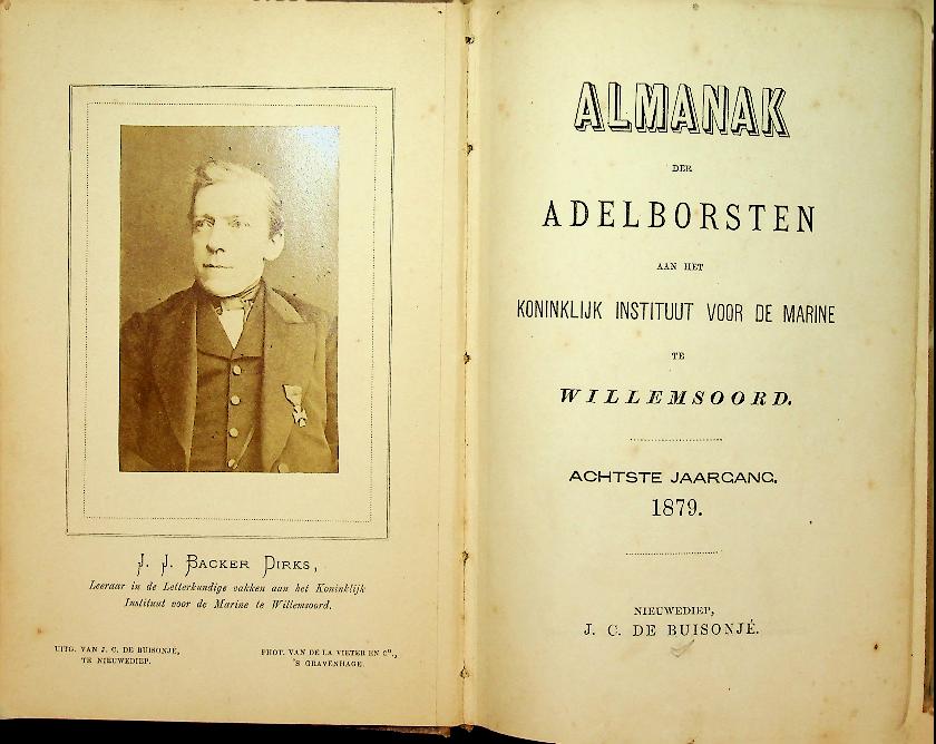 Collectief: 1879, hardcover, 288 blz., met uitvouwbare wereldkaart en foto. Almanak der Adelborsten (1879) is een jaarlijks “jaarboekje” voor adelborsten (marinecadetten) dat het leven en de activiteiten binnen het adelborstenkorps vastlegt. Het bevatte typisch overzichten en korte verslagen (bijv. van verenigingen, sportclubs en gebeurtenissen) en fungeerde zo als een praktisch naslagwerk én tijdsbeeld van de opleiding en het corpsleven in die periode. In goede staat