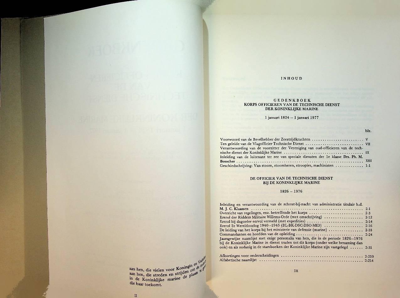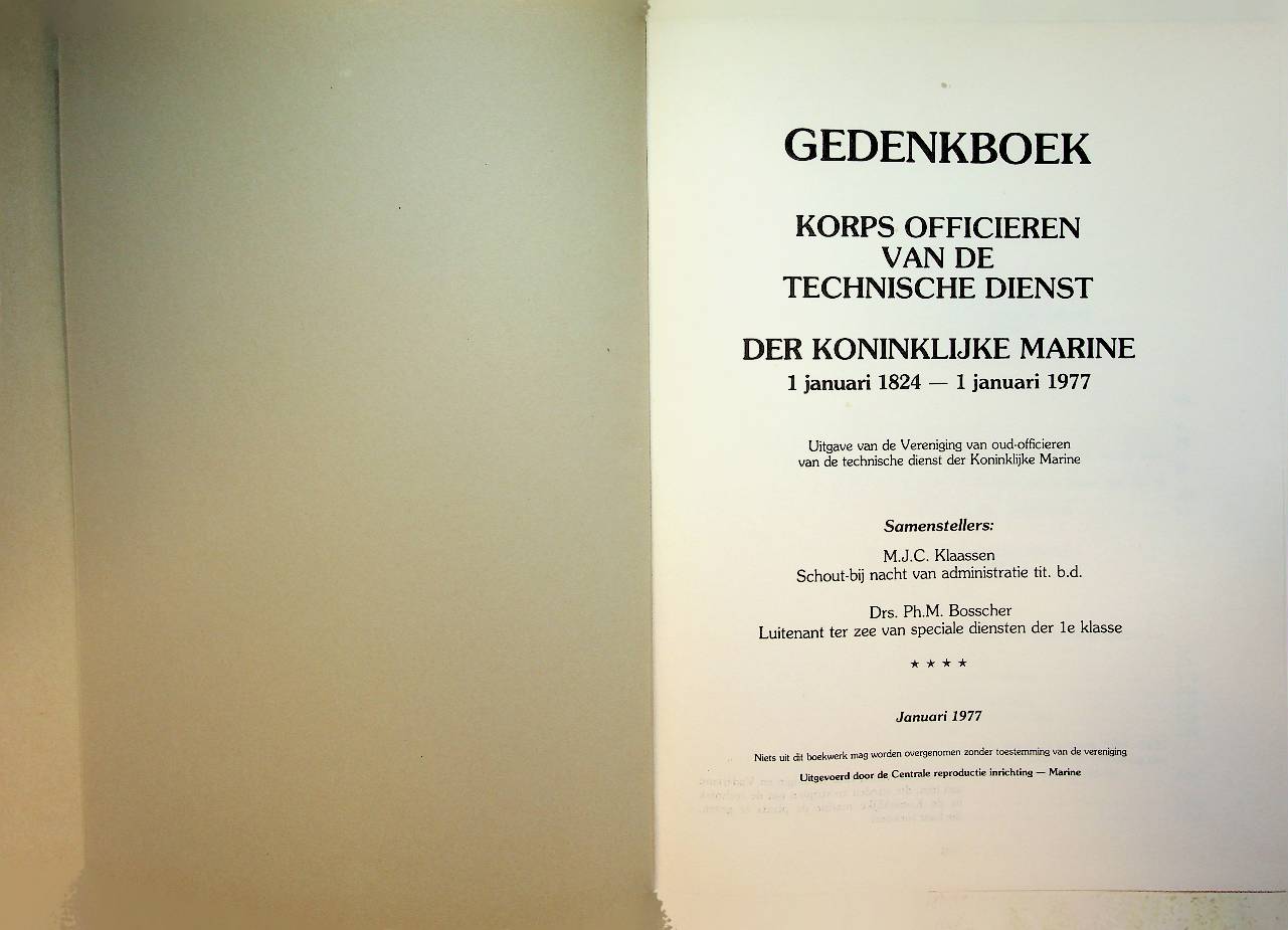 Diverse auteurs: 1999, hardcover 244 blz., met vele afbeeldingen en complete naamlijst over deze periode. Gedenkboek over de ontwikkeling, organisatie en werkzaamheden van het Korps Officieren van de Technische Dienst van de Koninklijke Marine vanaf de oprichting in 1824 tot 1 januari 1977, met veel aandacht voor technische vernieuwing en personele opbouw binnen de marine. Het boek is samengesteld door M.J.C. Klaassen en Ph.M. Bosscher en verscheen als uitgave van de Vereniging van Oud-Officieren van de Technische Dienst der Koninklijke Marine In zeer goede staat