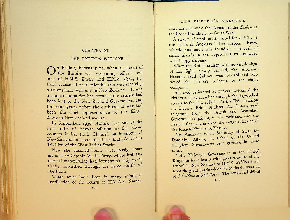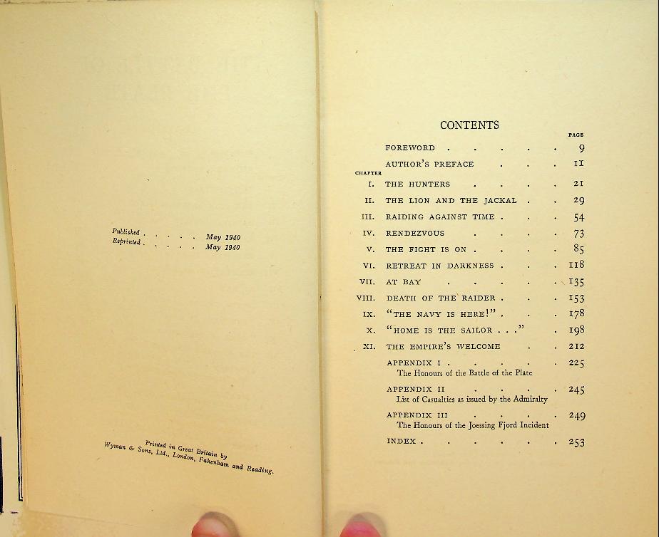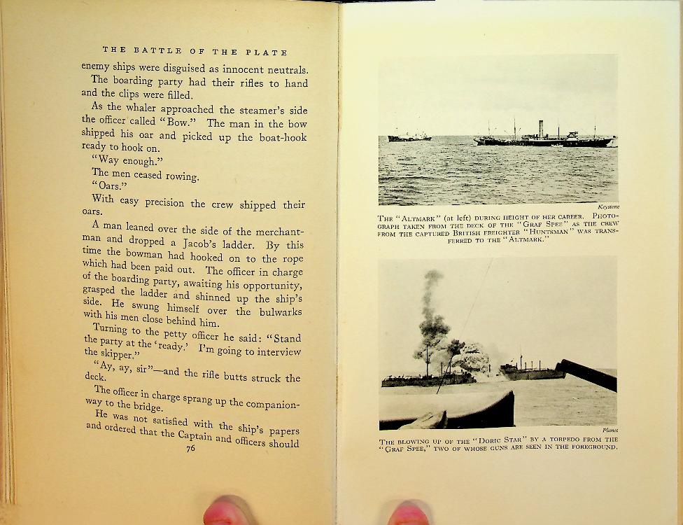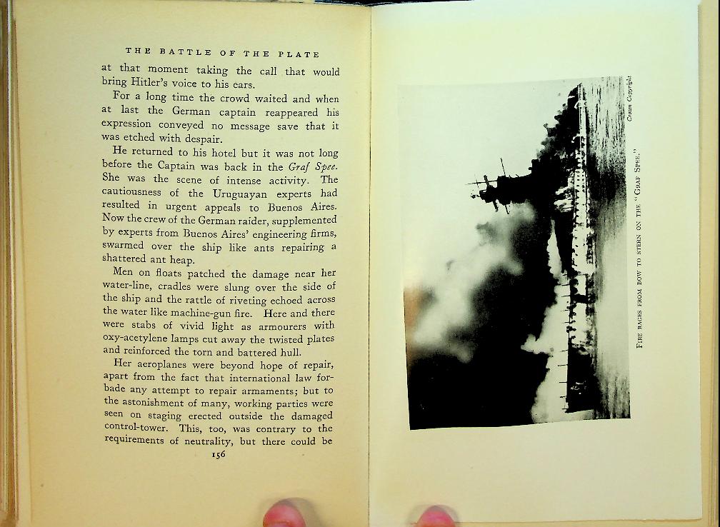 Campbell: 1940 London, bound 256 pages. A concise narrative of the first major naval engagement of the Second World War, when British cruisers confronted the German pocket battleship Admiral Graf Spee off the coast of South America in December 1939. It describes the chase, the fierce gunnery duel, and the diplomatic drama in Montevideo that ultimately led Captain Langsdorff to scuttle his damaged ship rather than face overwhelming British forces. with photographs. In fair condition