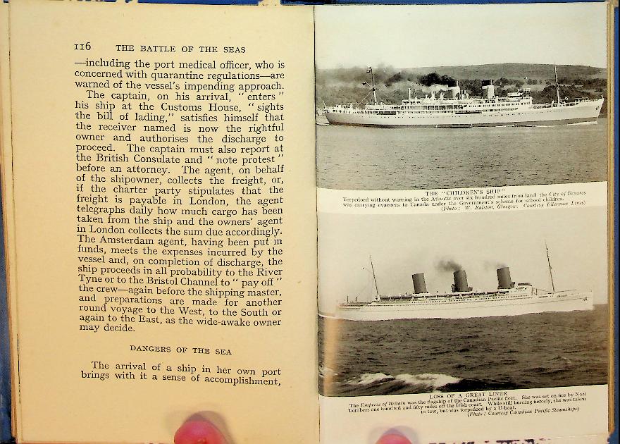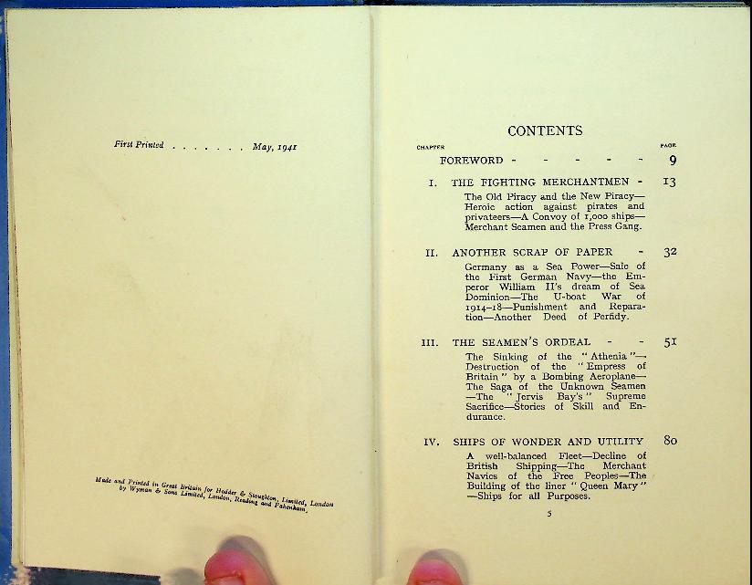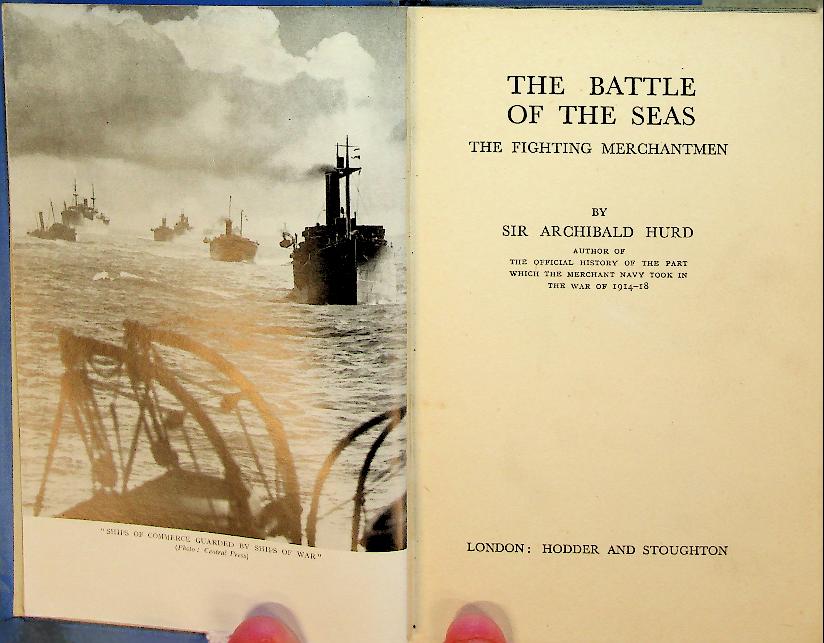 Hurd, Sir Archibald: 1941 London, hardcover 160 pages, with photo's. The Merchantmen in World War 2. Sir Archibald Hurd describes how British merchant ships and their crews faced submarine and air attacks while keeping vital sea routes open during the Second World War. Through vivid episodes of convoys, sinkings and rescues, it highlights the essential yet often overlooked role of the Merchant Navy in securing Allied survival at sea. In good condition
