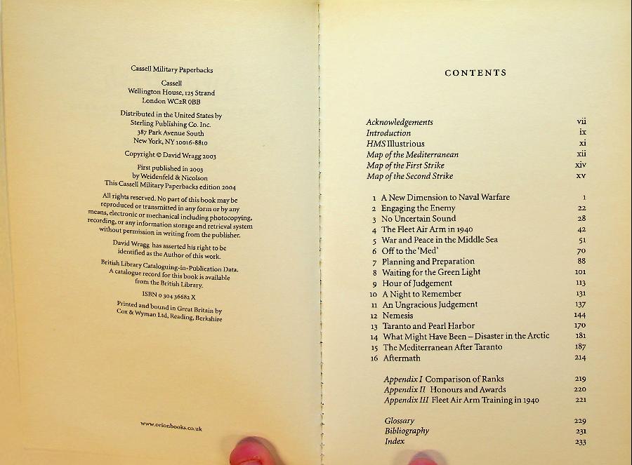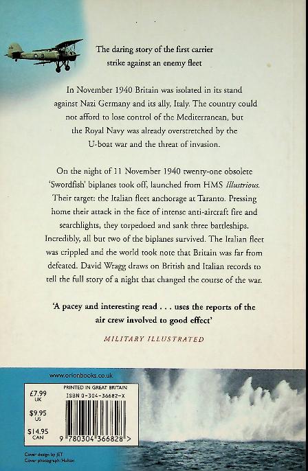 Wragg, D: 2003 UK, pocket 240 pages, with photos. David Wragg recounts how 21 obsolete Fairey Swordfish biplanes from HMS Illustrious crippled the Italian battle fleet in Taranto harbour on the night of 11 November 1940, transforming naval aviation strategy. Drawing on British and Italian records, Wragg places the raid in the wider context of Mediterranean warfare and demonstrates its decisive impact on the balance of naval power in the Second World War. ISBN 9780304366828 In very good condition