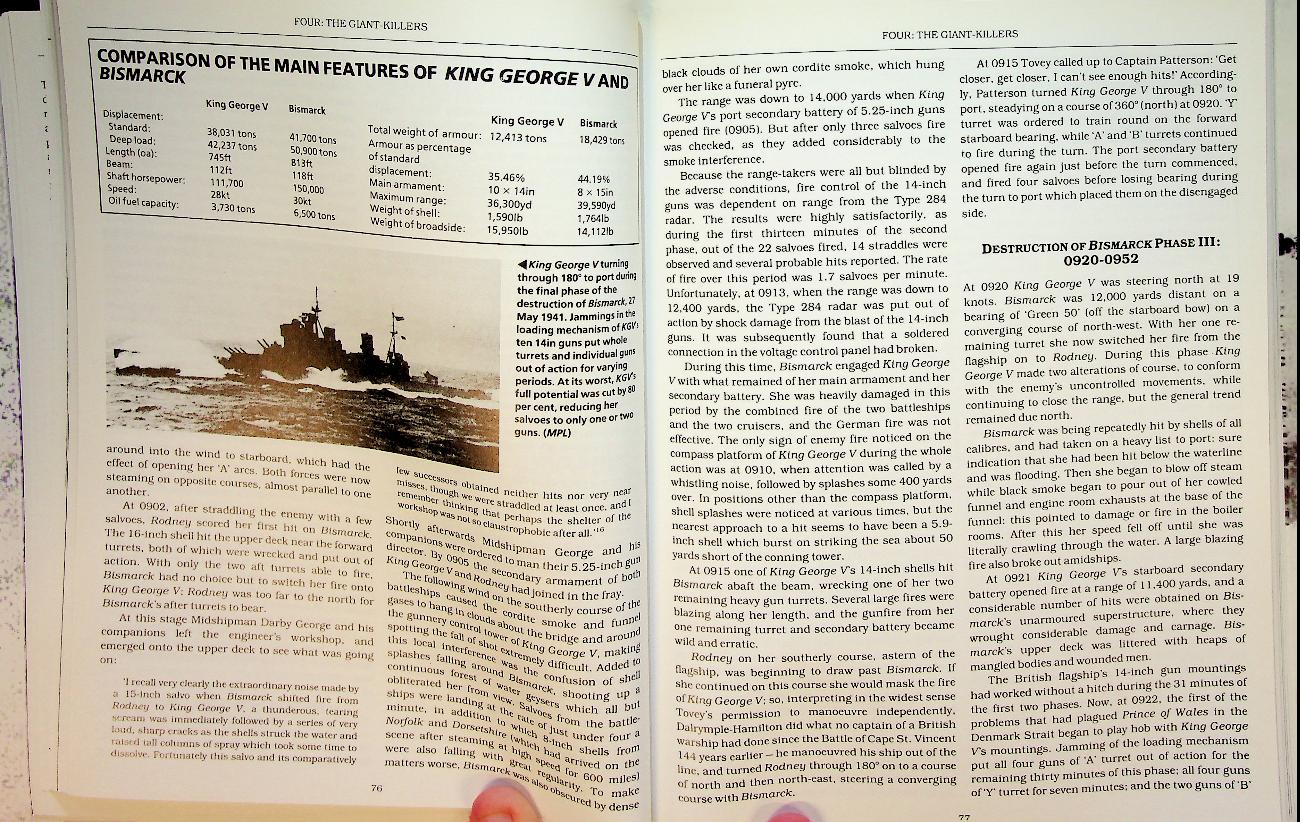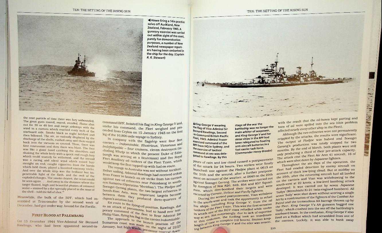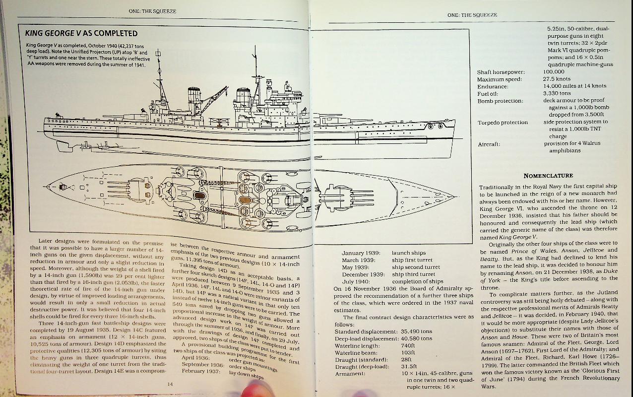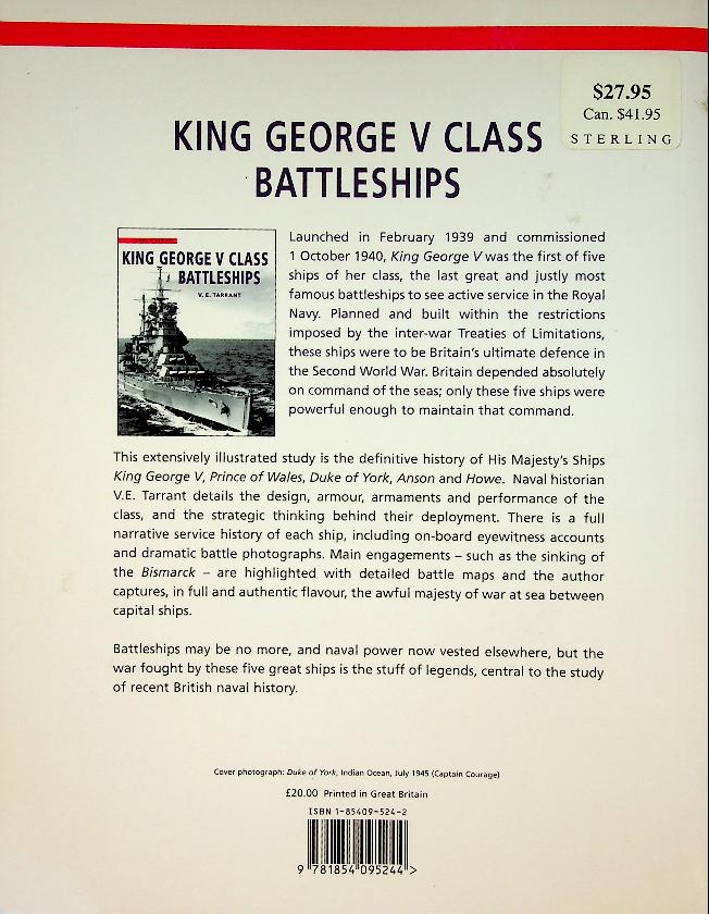 Tarrant, V.E.: 2000 Arms and Armour, softcover 286 pages, with photo's. History and operations of this Class. Detailed operational and technical history of the five British King George V–class battleships—Anson, Duke of York, Howe, King George V and Prince of Wales—covering their design, World War II service, and the experiences of their crews. The book combines analysis of their controversial armament and protection with narrative accounts of actions such as the hunt for Bismarck and Arctic and Mediterranean convoy operations. ISBN 9781854095244 In very good condition
