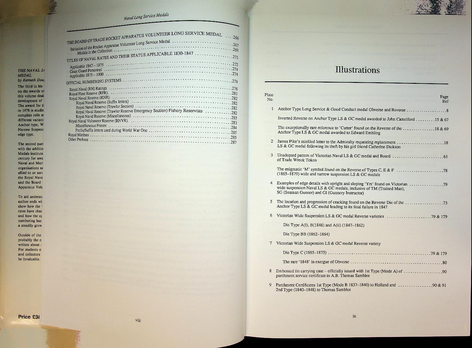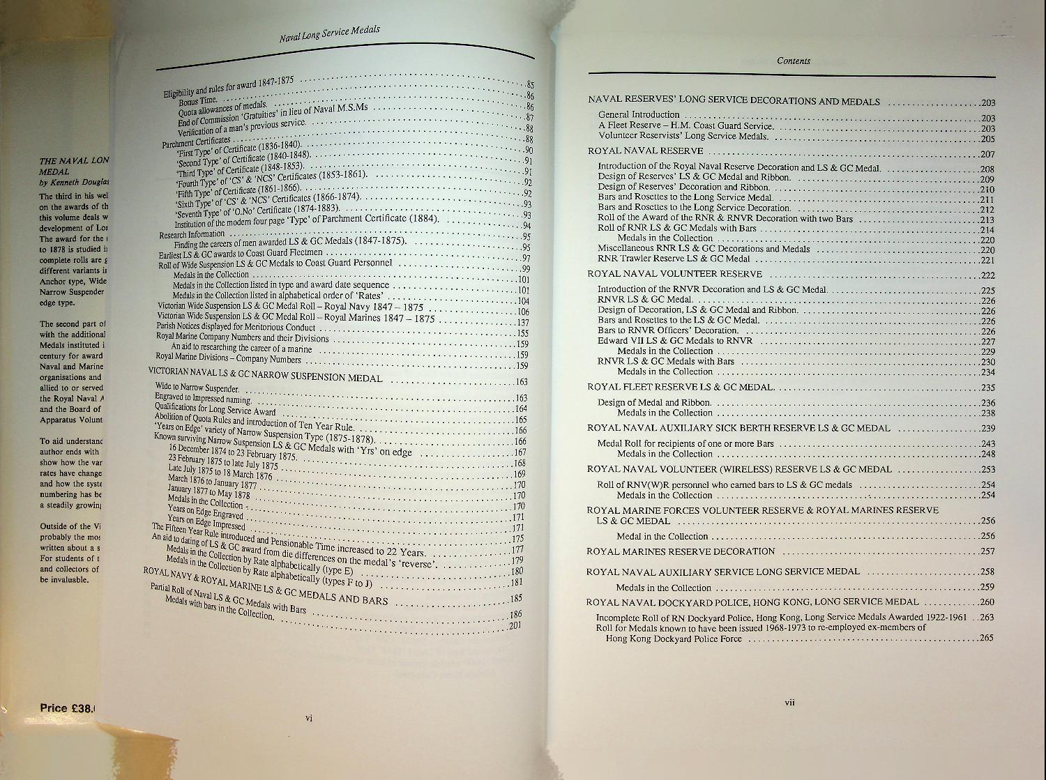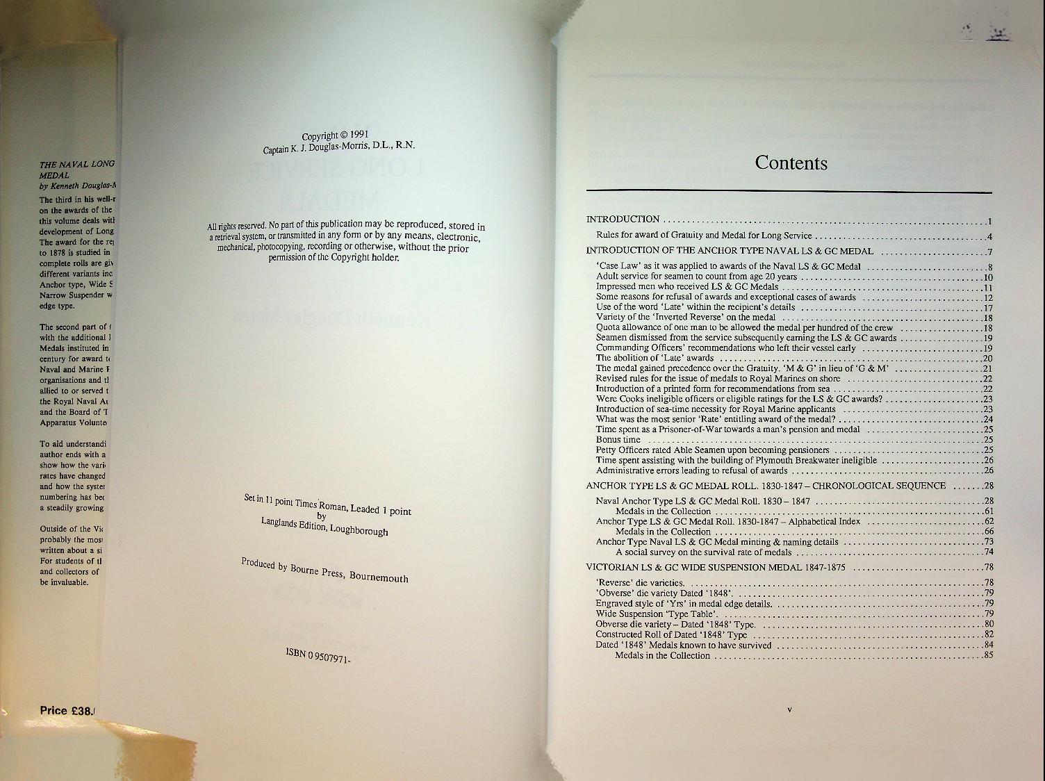 Douglas-Morris, K: 1991 London, hardcover with dustjacket 287 Pages. History, the medals, the receivers. The Naval Long Service Medals 1830–1990 is a detailed reference work on the history, types and award regulations of British naval long service medals and their recipients from the introduction of the first medal in 1830 up to 1990. The book systematically documents medal issues, variations, inscriptions and rolls, making it a standard reference for collectors and historians of British naval and maritime decorations ISBN 09507971 In very good condition.