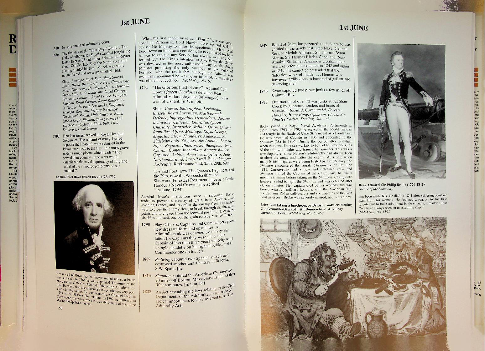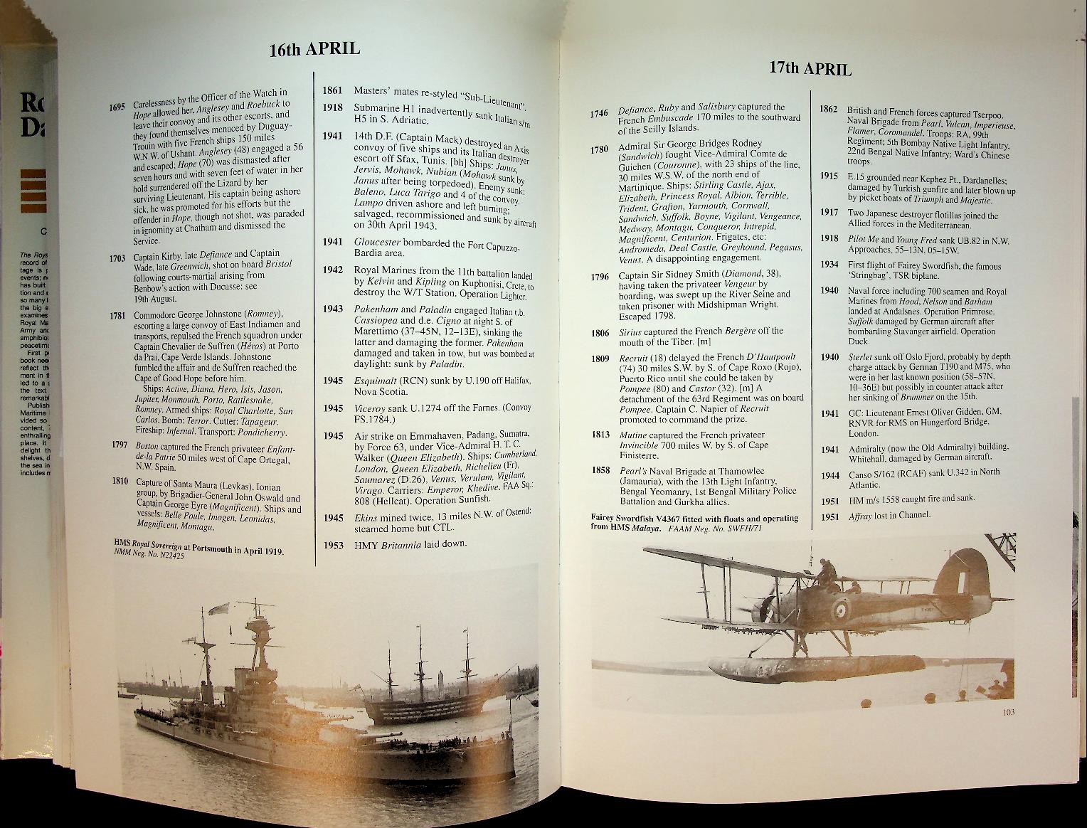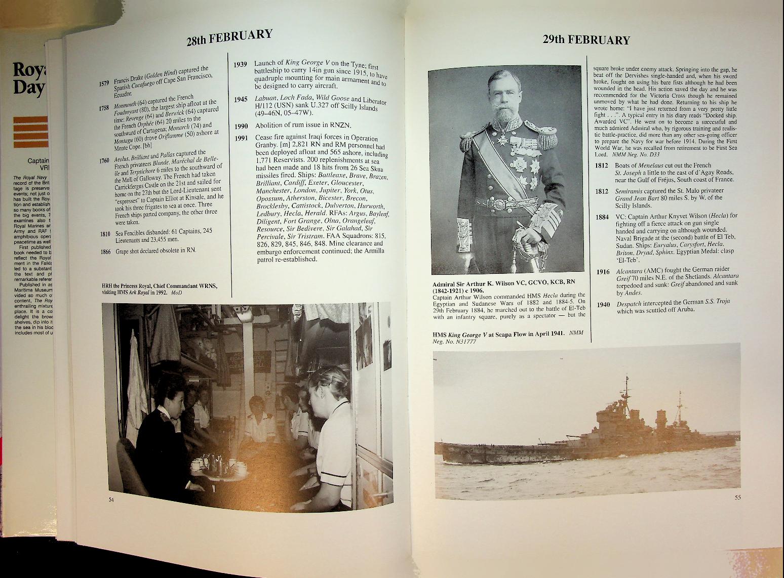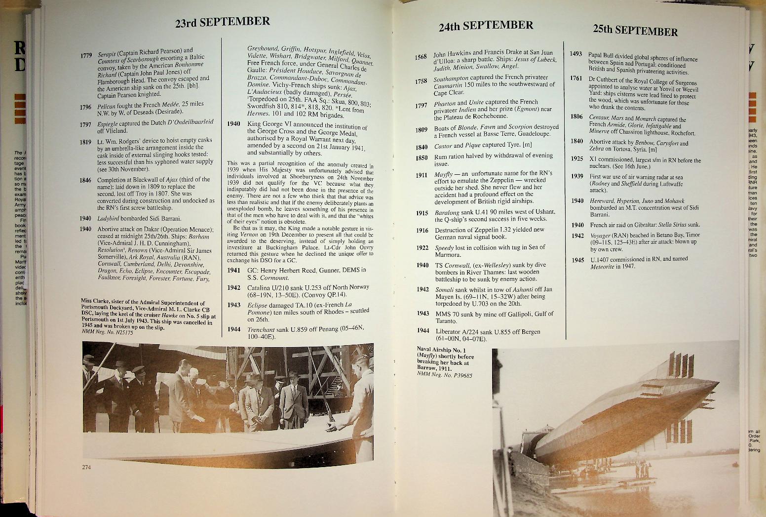 Sainsbury, A.B.: 1992 Ian Allan Publications, hardcover with dustjacket 424 pages. Chronological with photo's and illustrations. New edition expanded and revised. A chronologically arranged reference work that recounts key events in the Royal Navy’s 500‑year history, from great fleet actions to lesser-known incidents, presented as a diary entry for every day of the year. It offers an accessible overview of Britain’s maritime heritage for enthusiasts and researchers alike, highlighting operations, personalities, and turning points that shaped the “Senior Service.” ISBN 9780711021235 / 0711021236 Good condition.