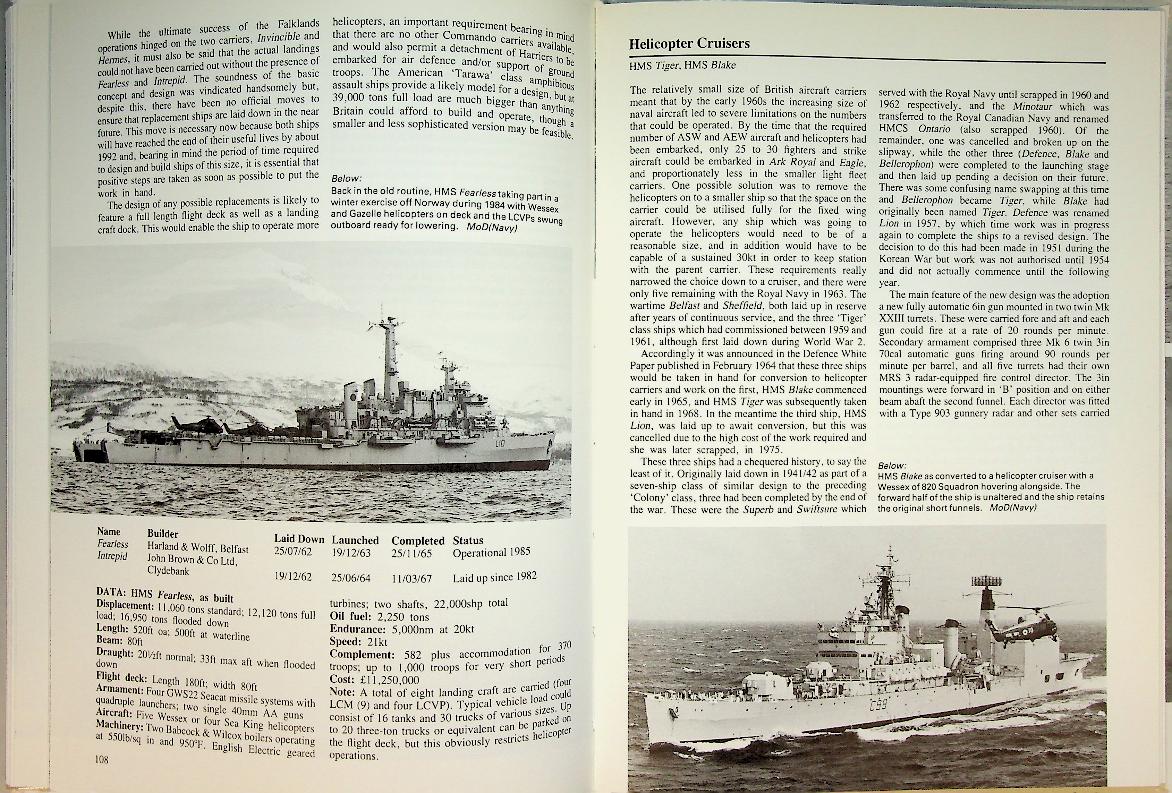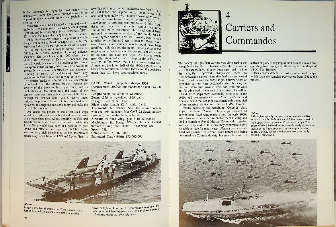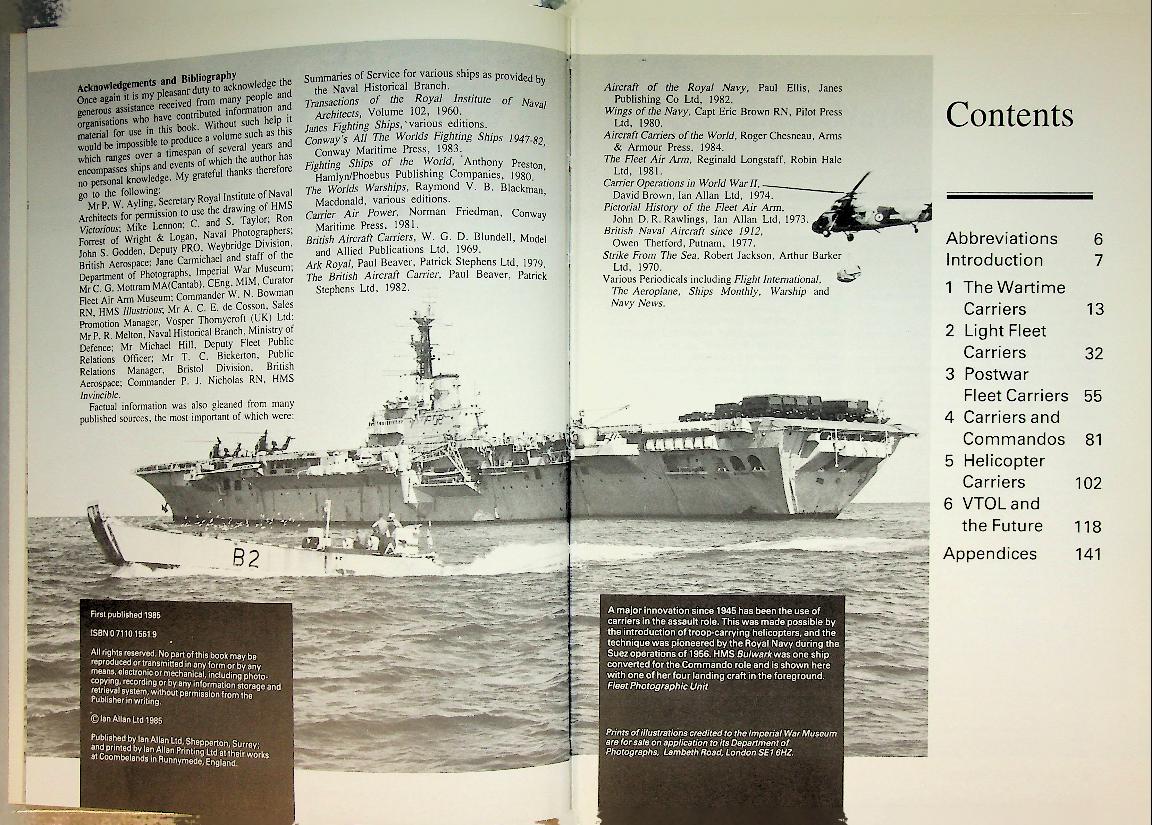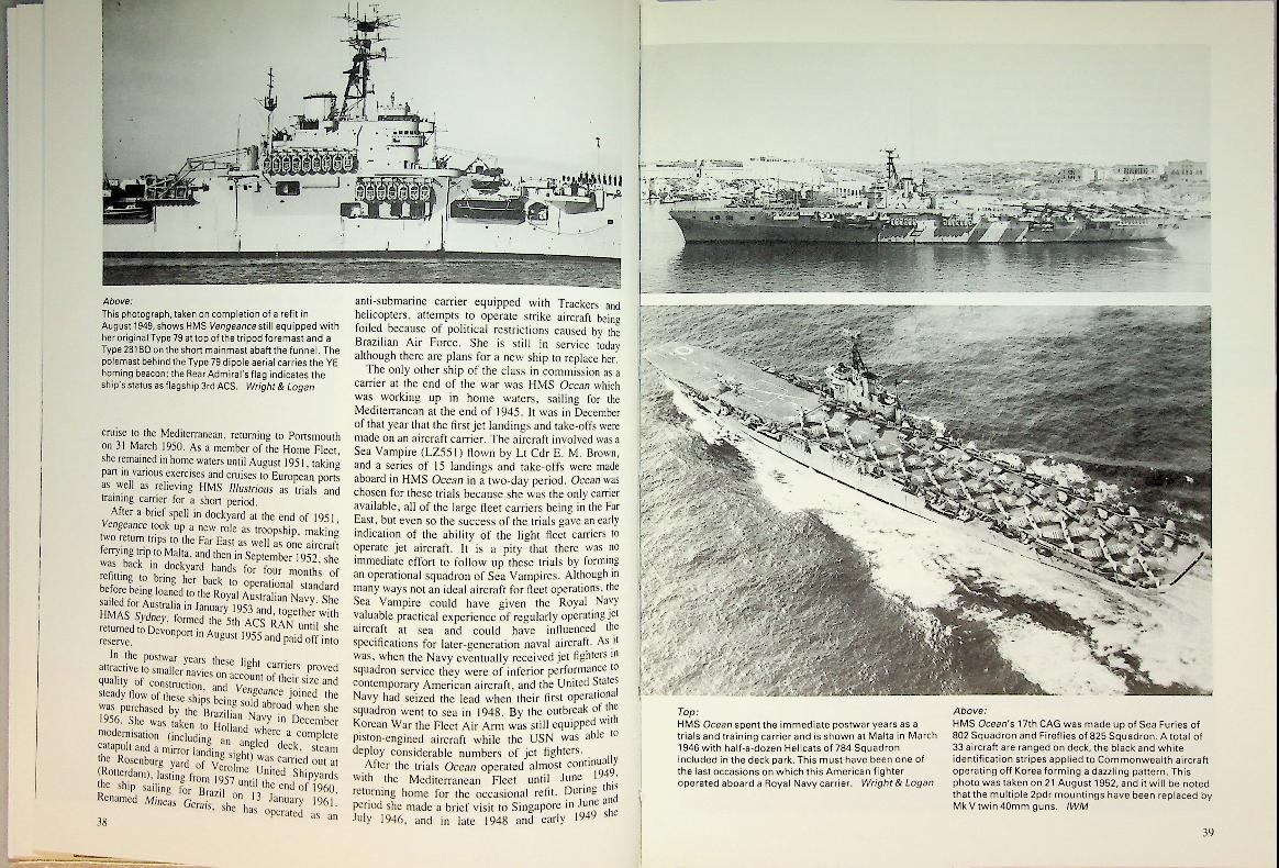 Marriott, L: 1985 Ian Allan, hardcover 144 pages, with photos and detailed information.This book provides a detailed overview of the Royal Navy's aircraft carriers from the end of World War II through the Cold War era, covering their design, development, and operational history up to 1990. It includes technical specifications, photographs, and insights into the strategic role of these carriers during a period of rapid naval aviation change. ISBN 9780711015616 In very good condition