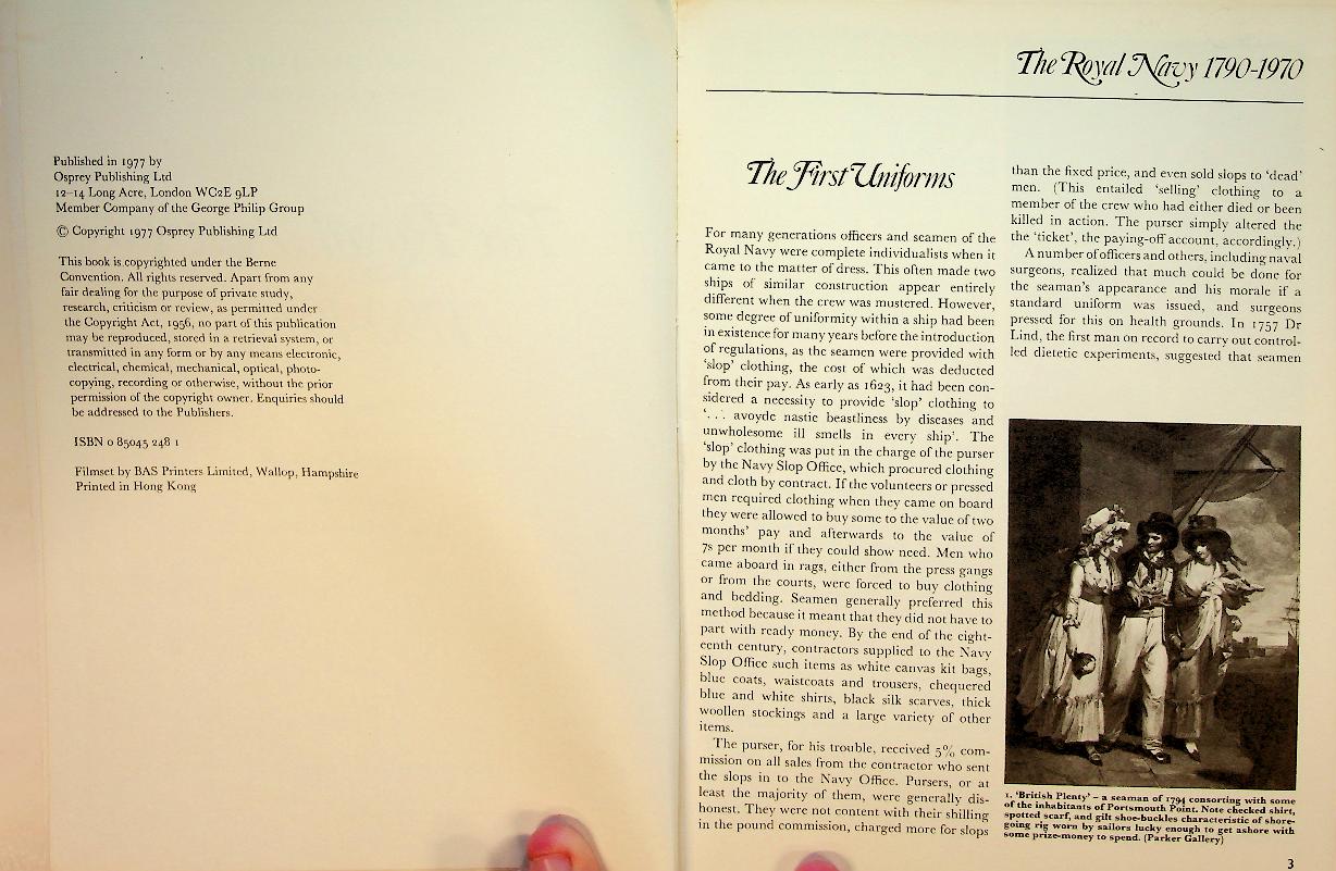 Wilkinson-Latham, R: 1977 Osprey UK, softcover 40 pages, with photos and illustrations. Uniforms. Robert Wilkinson-Latham provides a detailed overview of the evolution of Royal Navy uniforms from the late 18th century up to 1970, using dress regulations and illustrations to show changes in style, rank, and equipment over nearly two centuries. It is a concise, illustrated guide that highlights the prestige and influence of the Royal Navy during this period, serving as a reference for both enthusiasts and historians. ISBN 9780850452488 / 0850452481 In good condition