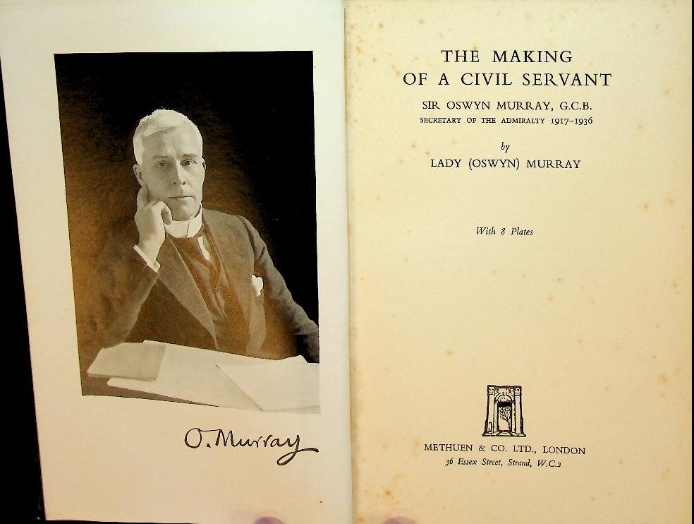 Murray, Lady Oswyn: 1940 London, hardcover 211 pages, with illustrations and index. The Making of a Civil Servant is a biographical study in which Lady Mildred March Murray portrays the life and career of her husband Sir Oswyn Murray, who served as Secretary of the Admiralty from 1917 to 1936 and helped shape British naval administration between the world wars. The book offers an insider’s view of high-level civil service, highlighting Murray’s character, sense of duty, and influence on Admiralty policy-making during a transformative period in British maritime and military history. In good condition.