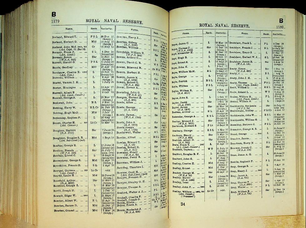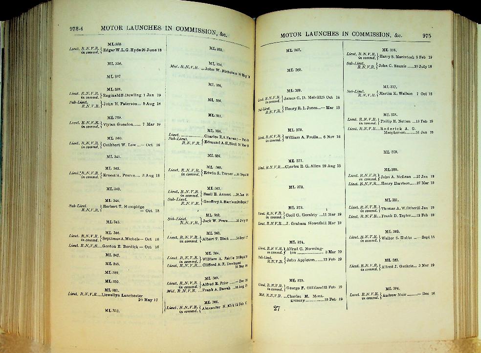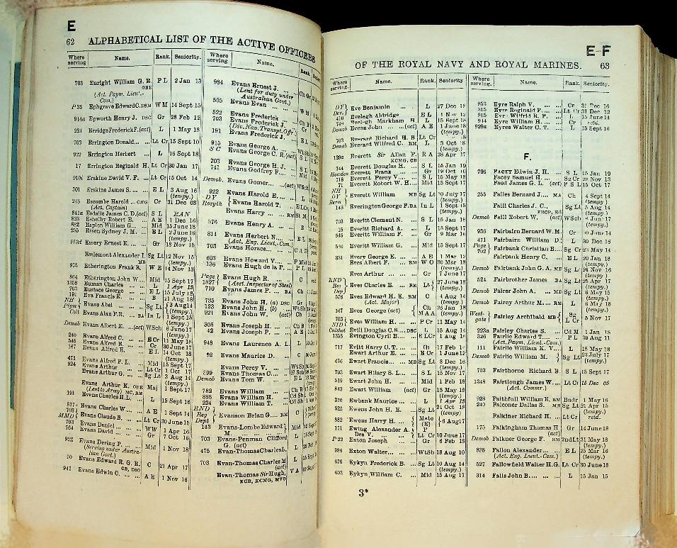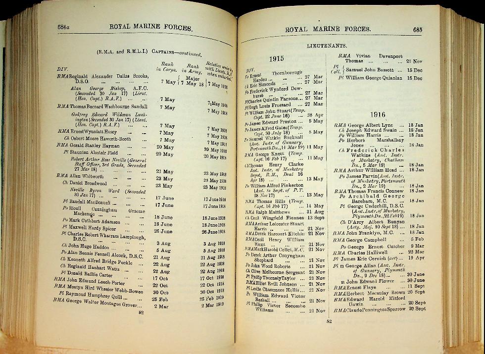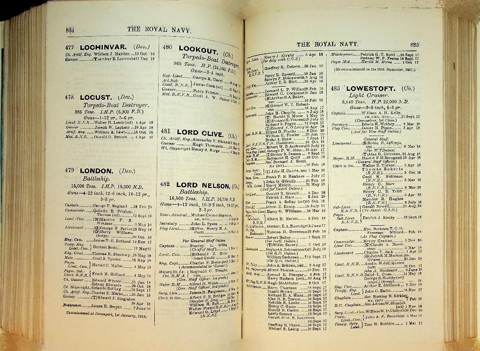 HMSO: 1919 Royal Navy UK, hardcover 2248 pages. New hardcover by professional binder. This is a significant work of reference in that it provides the personnel state of the Royal Navy as at the end of the Great War; the list is corrected to 18th December 1918. And not just the personnel are featured, for here are listed HM ships of all types including merchant vessels commissioned as HM Ships. With most of the ships listed type, armament, displacement and propulsion details are given, e.g, LION. Battle Cruiser. 26,350 tons. 70,000 HP. 8-13.5 inch, 16-4 inch, 4-3pdr, This publication begins with the alphabetical list of the officers on the active list of the Royal Navy and the Royal marines showing their rank, seniority and of the retired and emergency officers serving.where serving and this includes retired and emergency offic If the name is preceded by a number, this identifies the ship or shore station in which he is serving (they are all numbered). This is followed by a list showing officers according to seniority. Other lists are of Royal Marines; ships/shore stations with their identifying number and showing officers serving with them; RNR, RNVR, Dominion naval officers; retired RN, RM and RNR officers; invalided officers and much more. There is a section for Honours and Awards including VC (shown after the Orders of Knighthood, the DSO and Royal Red Cross), DSC, DSM and foreign awards. At the end there is a section on Dress Regulations for officers of the Fleet and even a list of lantern ... In very good condition