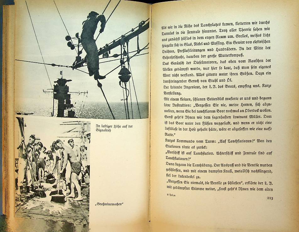 Gunther Prien: Berlin 1940, hardcover with dust jacket 191 pages, with photos. "Mein Weg nach Scapa Flow" describes Günther Prien's daring night-time raid with U-47, infiltrating the heavily defended British naval base at Scapa Flow and successfully sinking the battleship Royal Oak before escaping. The book emphasizes his audacious tactics and the impact of the raid on both German morale and British naval operations. Book and Dust jacket In very good condition. German language