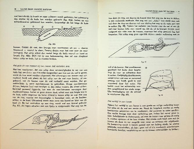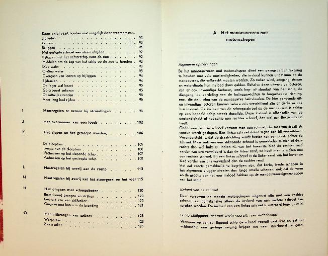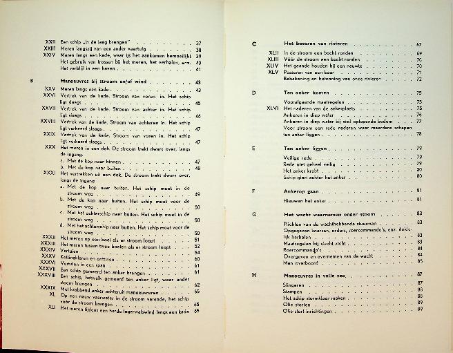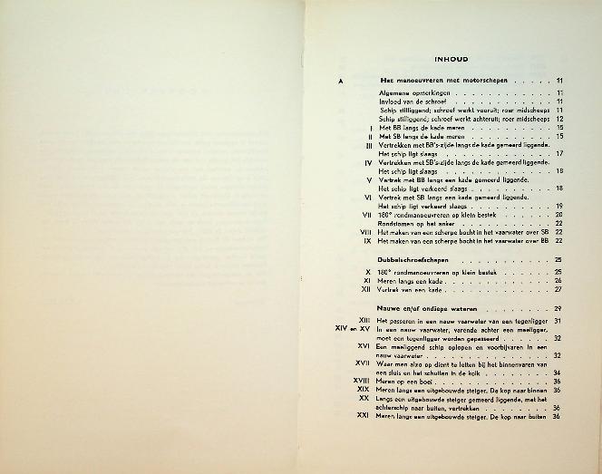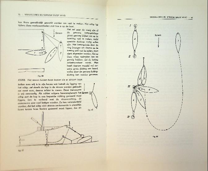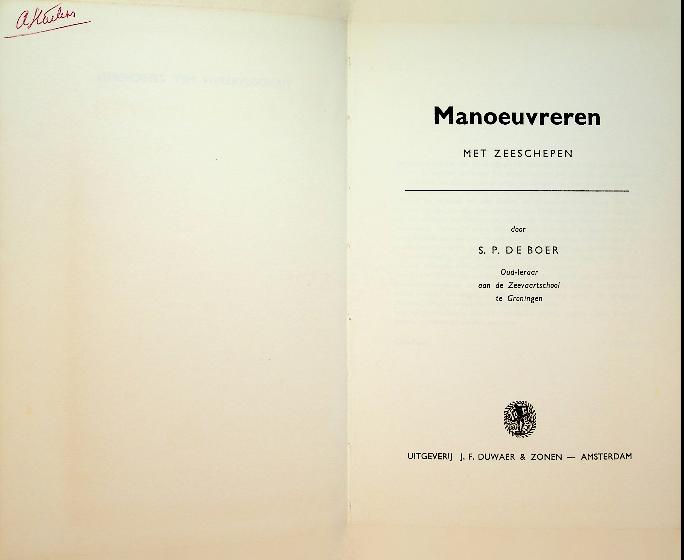 Boer, S.P. de: ca. 1955 Duwaer Amsterdam, hardcover, 128 blz., geïllustreerd. Manoeuvreren met zeeschepen is een praktijkgericht leerboek dat de manoeuvreereigenschappen van zeeschepen uitlegt aan de hand van krachtenleer, hydrodynamica en regelgeving, toegespitst op de dagelijkse beroepspraktijk van de zeevarende. Het behandelt onder meer ankeren, meren, sleepbootassistentie, nauwe vaarwaters en verkeersscheidingsstelsels, met veel schema’s en voorbeelden om complexe manoeuvres veilig en gecontroleerd uit te voeren.