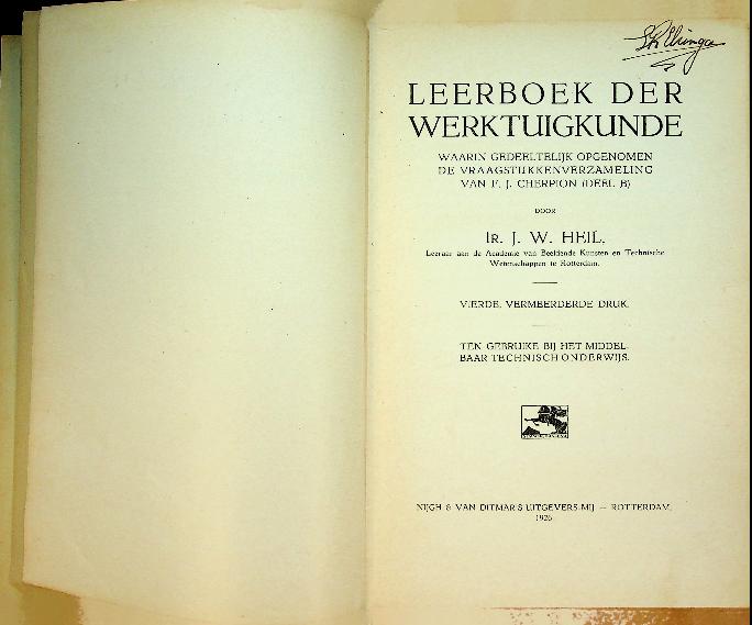 Heil, J.W.: 1926 Rotterdam, hardcover, 314 blz., geïllustreerd. Leerboek der Werktuigkunde van J.W. Heil is een klassiek Nederlandstalig studieboek dat de basisprincipes van mechanica en werktuigbouw systematisch behandelt, bedoeld voor middelbaar en (voorbereidend) hoger technisch onderwijs. Het boek combineert theorie met vraagstukken en toepassingen, zodat leerlingen zowel inzicht in begrippen als vaardigheid in het oplossen van reken- en ontwerpproblemen opdoen. In zeer goede staat