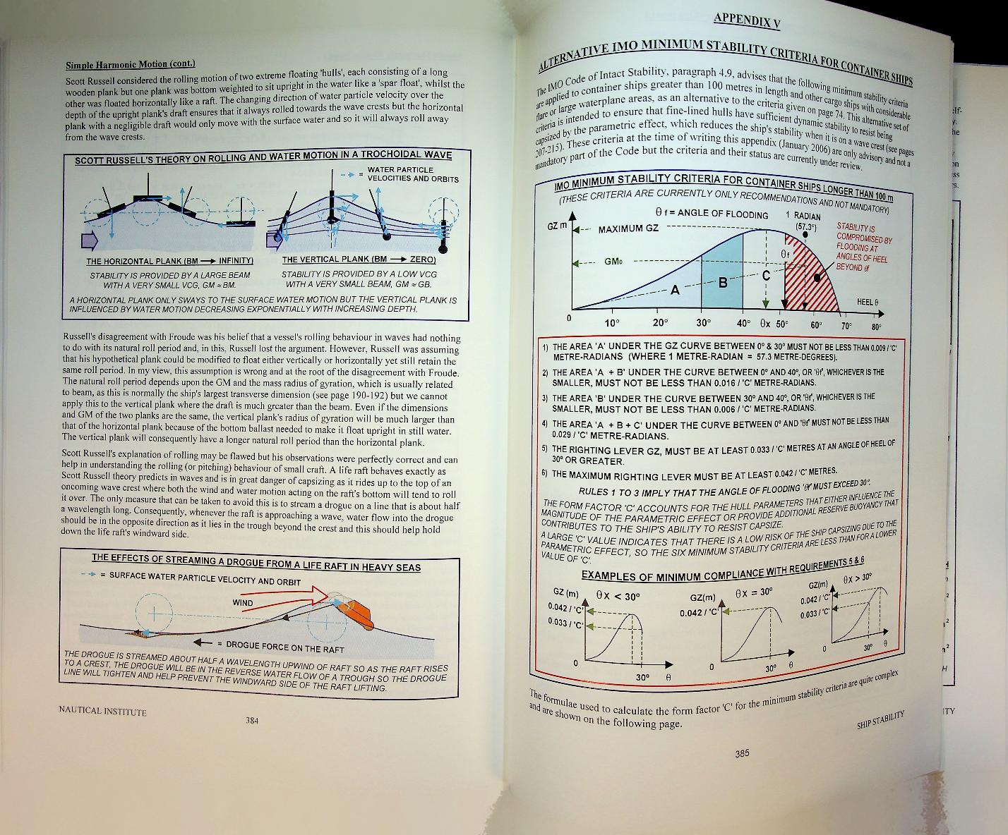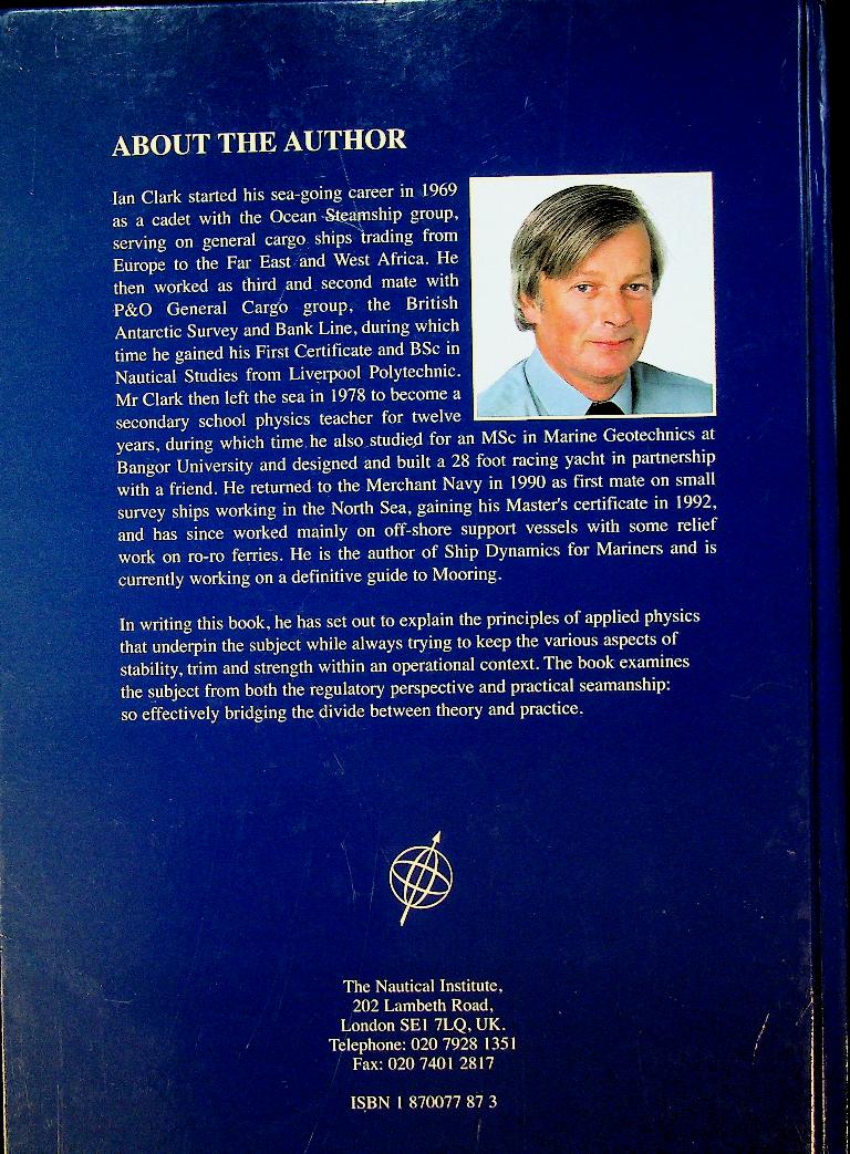 Clark, I.C.: 2008 The Nautical Institute, hardcover, 429 pages, illustrated. I.C. Clark explains the theory, regulations and calculations needed to ensure that merchant ships and fishing vessels maintain adequate stability, safe trim and structural strength under varying loading and operating conditions. It is designed as a practical reference and teaching text for mates, masters and other maritime professionals, linking naval architectural principles with real-world ship operations and damage-control scenarios. ISBN 9781870077873 / 1870077873. In good condition