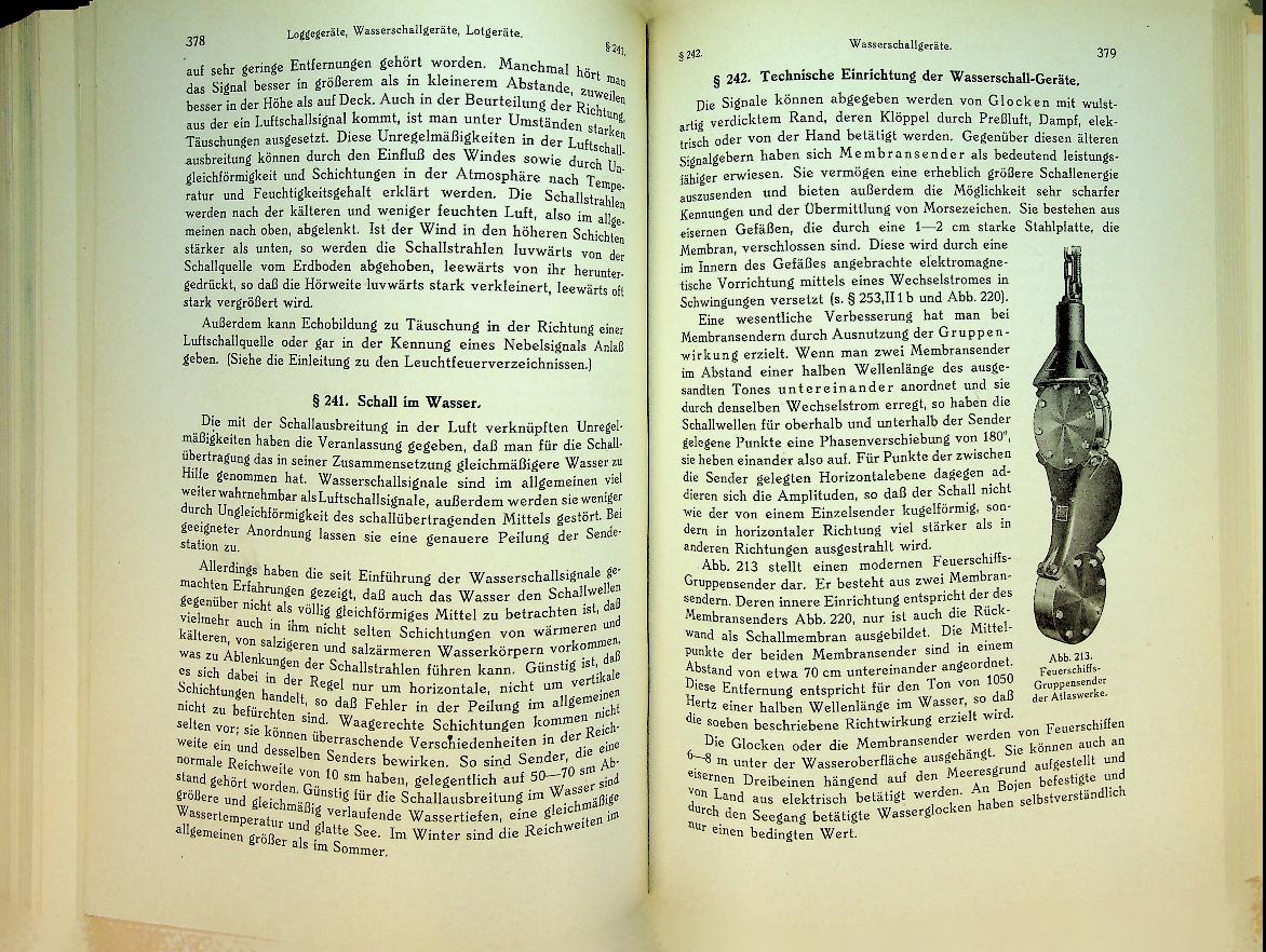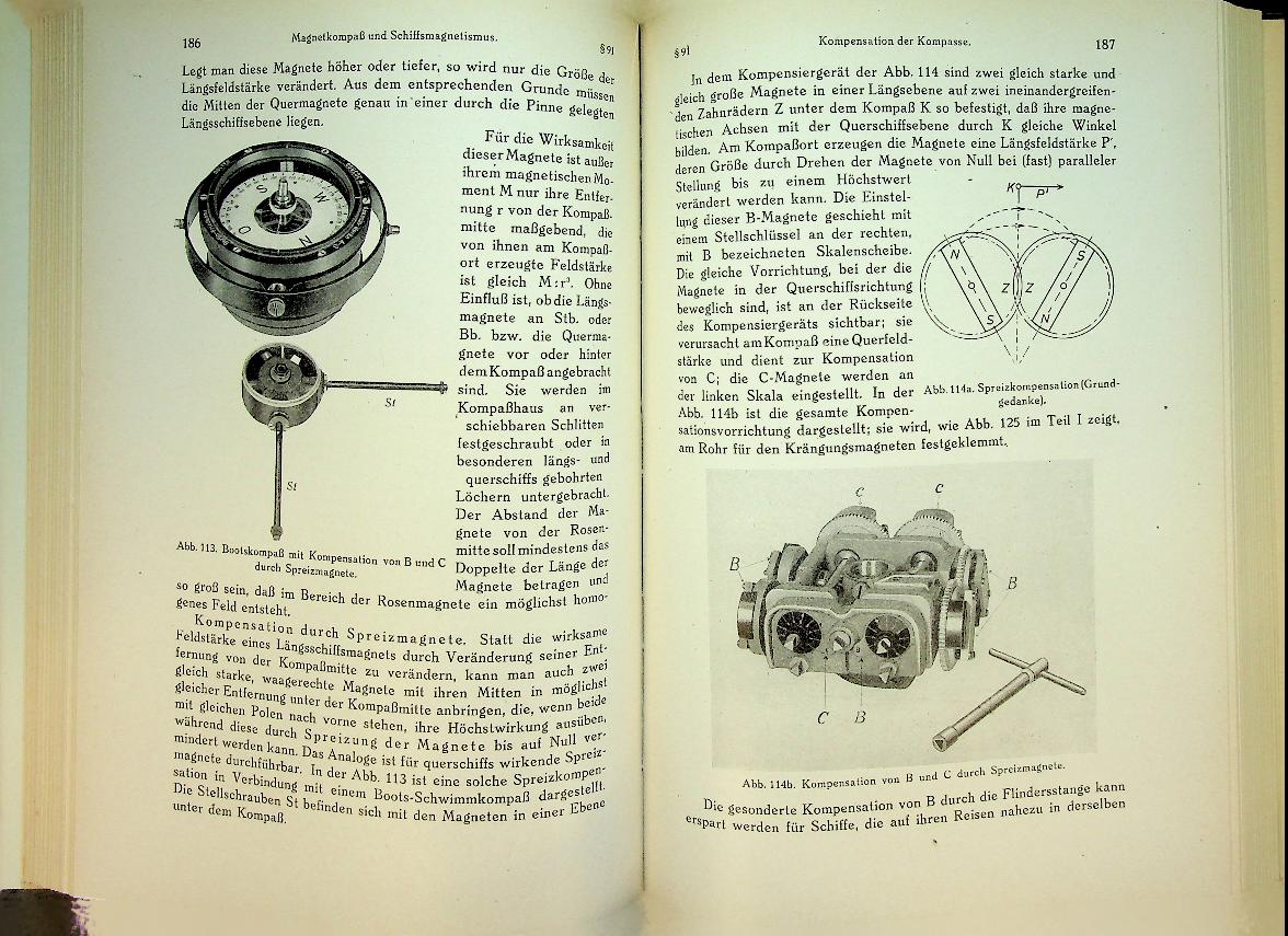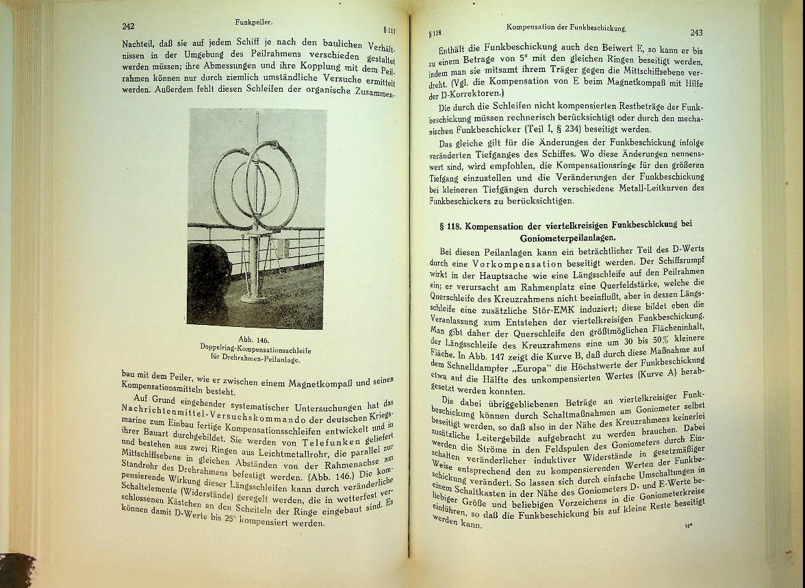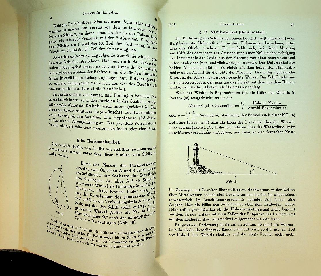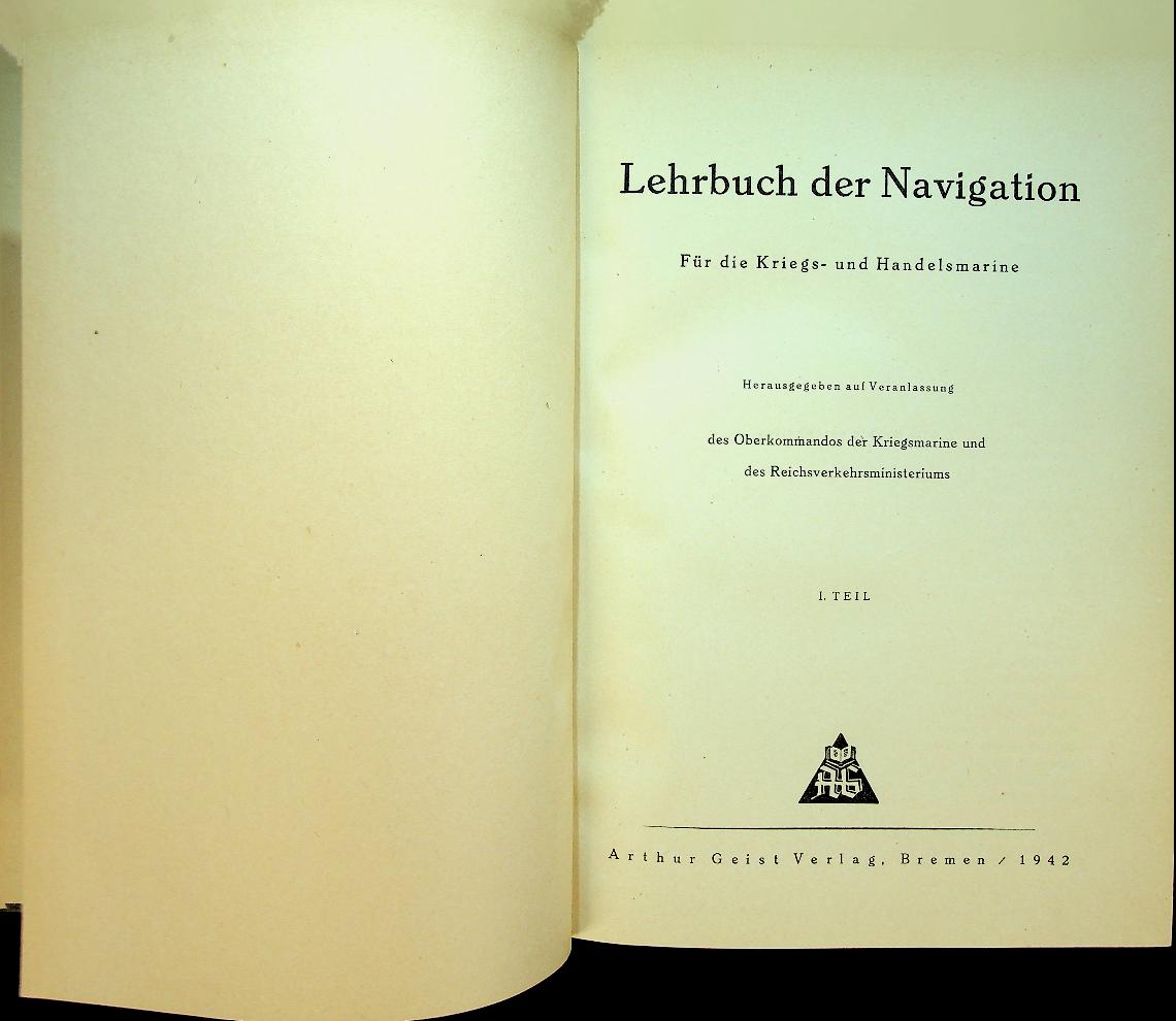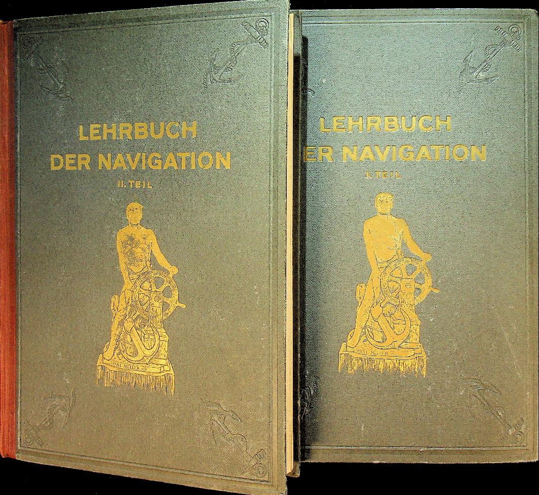 Collective: 1942 Geist Verlag Bremen, hardcover, 515 + 393 pages, illustrated and complete with the attachments in the back of the books. Lehrbuch der Navigation für die Kriegs- und Handelsmarine (Teil I und II) is a World War II era navigation textbook published by Arthur Geist Verlag in Bremen in 1942, providing a comprehensive course in terrestrial and celestial navigation for naval and merchant officers. The volumes cover topics such as chart work, dead reckoning, pilotage, tides and currents, as well as astronomical position fixing with sextant and chronometer, and were extensively illustrated with diagrams, formulae and examples for use in German naval training. In very good condition