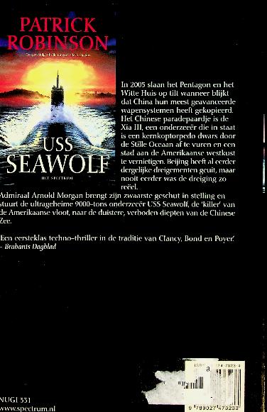 Robinson, P: 2001 Spectrum, softcover, 350 blz. USS Seawolf is een marine-thriller waarin de ultramoderne Amerikaanse kernonderzeeër USS Seawolf tijdens een spionagemissie tegen China wordt ontdekt, waarop de bemanning wordt gevangengezet en de boot in Chinese handen valt. National Security Advisor Arnold Morgan zet vervolgens een riskante reddingsoperatie en sabotageactie in gang om de bemanning te bevrijden en te voorkomen dat Amerikaanse technologie in Chinese wapensystemen belandt, met politieke repercussies in Washington door de rol van de presidentiële zoon bij het incident. ISBN 9789027473233 In goede staat