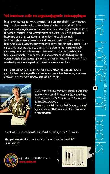 Cussler, Clive: 2005, softcover, 383 blz. Poolstorm volgt NUMA-agent Kurt Austin en zijn team wanneer een briljante maar radicale wetenschapper een methode activeert om de magnetische polen te laten verschuiven, wat wereldwijde navigatie en communicatie dreigt te ontregelen. Terwijl dieren en systemen in verwarring raken, racet het team om sabotage te stoppen die de aarde in chaos kan storten. ISBN 9789044319699 In zeer goede staat