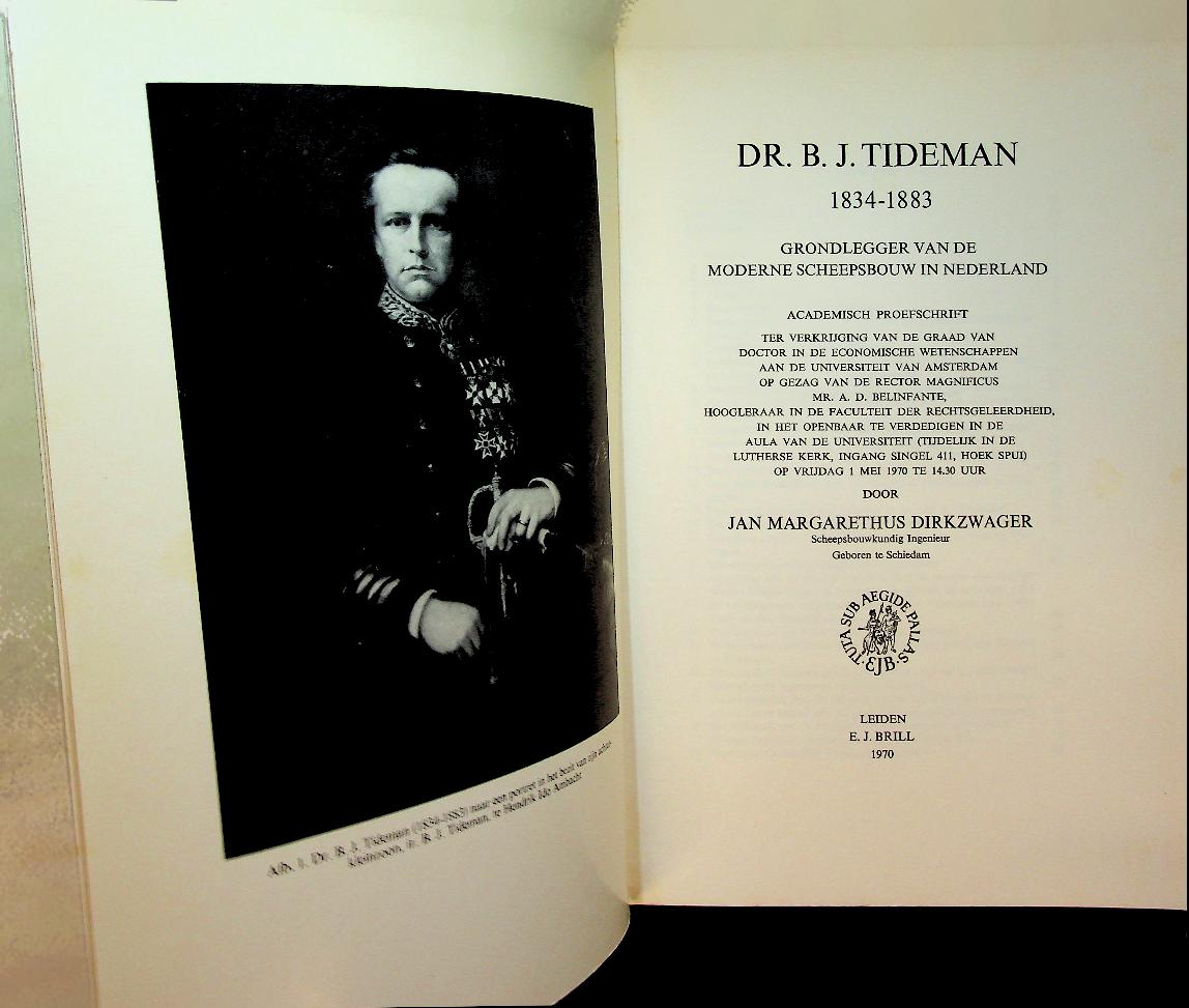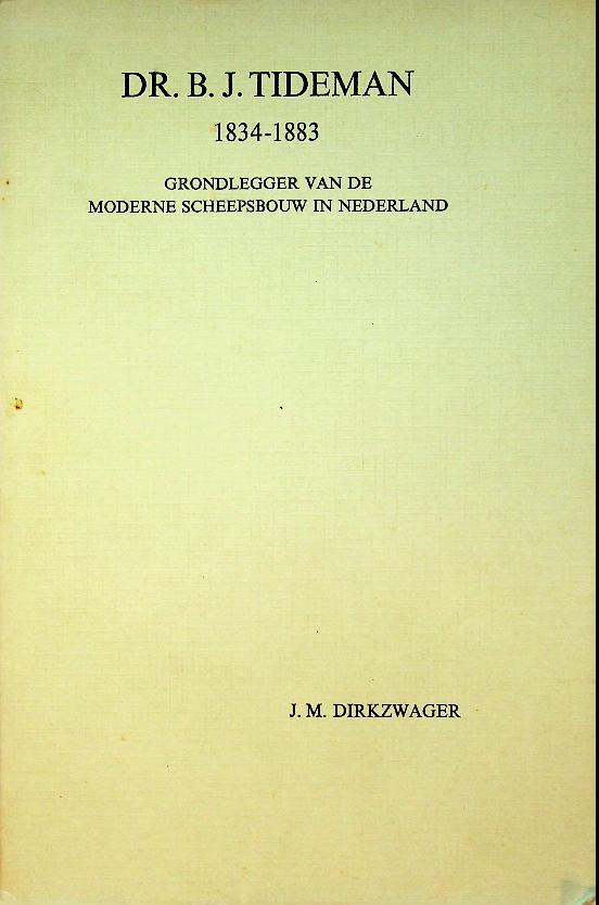 Dirkzwager, J.M.: 1970 Leiden, 243 Blz., met enige foto's en illustraties. Het boek Dr. B.J. Tideman 1834–1883. Grondlegger van de moderne scheepsbouw in Nederland van J.M. Dirkzwager schetst het leven en werk van Bruno Joannes Tideman, de marine‑ingenieur en hoogleraar die de Nederlandse scheepsbouw in de 19e eeuw van een ambachtelijke tot een wetenschappelijke discipline omvormde. Het belicht zowel zijn rol bij de modernisering van de oorlogsvloot en de oprichting van scheepswerf De Schelde als zijn invloed via onderwijs en standaardwerken, waarmee hij de basis legde voor de latere internationale positie van de Nederlandse scheepsbouw. In goede staat