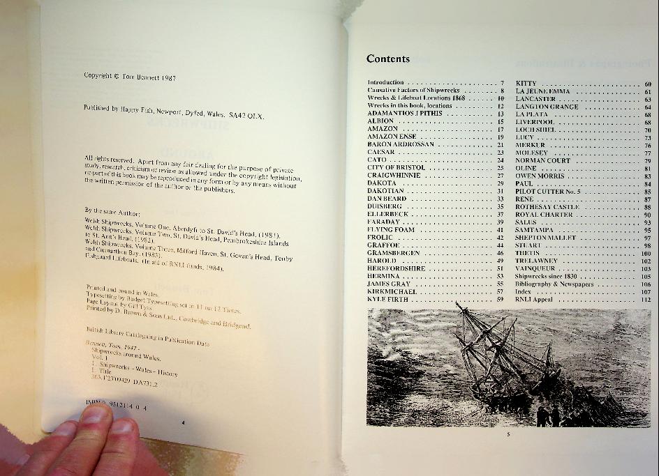 Bennett, Tom: 1987 UK, softcover, 112 pages, illustrated. A concise, illustrated gazetteer, Shipwrecks around Wales, Volume 1 surveys notable wreck sites along the Welsh coast with historical notes, causes of loss, maps, and brief specifications arranged for quick reference. The volume mixes sober incident accounts with lighter anecdotes, and includes sections like causative factors, wrecks by name, and site details to support divers, historians, and readers of maritime history. ISBN 9780951211403 In very good condition