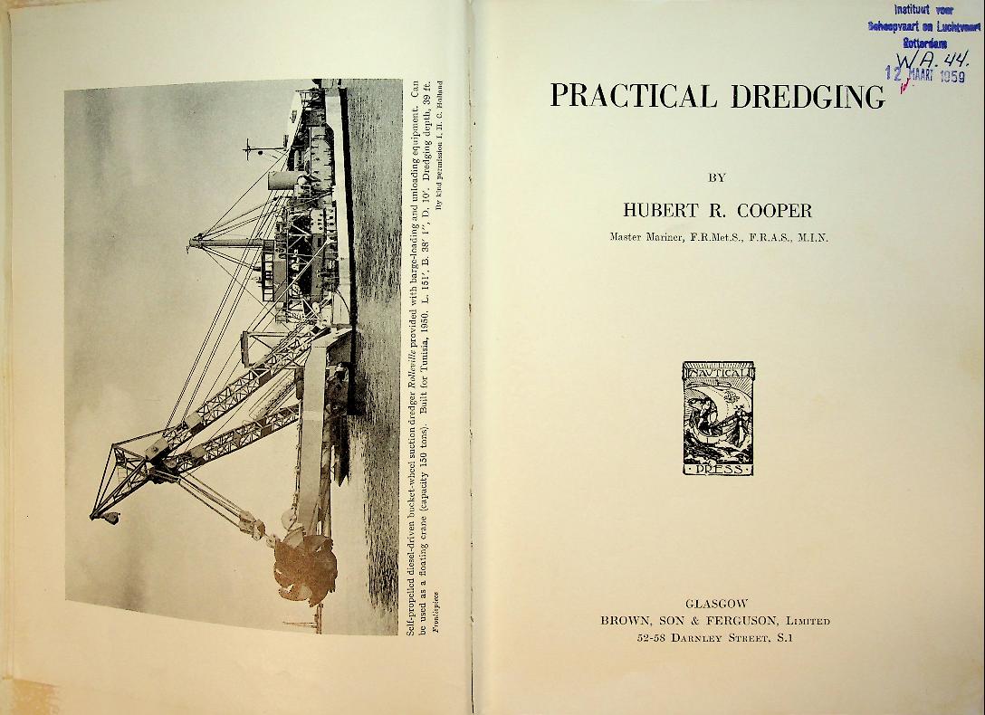 Cooper, Hubert R.: Glasgow 1958, hardcover 270 pages. All about dredging and the equipment,with photographs and foldingouts of dredgeships. a comprehensive overview of dredging operations from a practical standpoint, covering the types, functions, and operation of various dredgers. The book is intended for professionals and authorities involved in the dredging industry and related subjects. With a index. In good condition