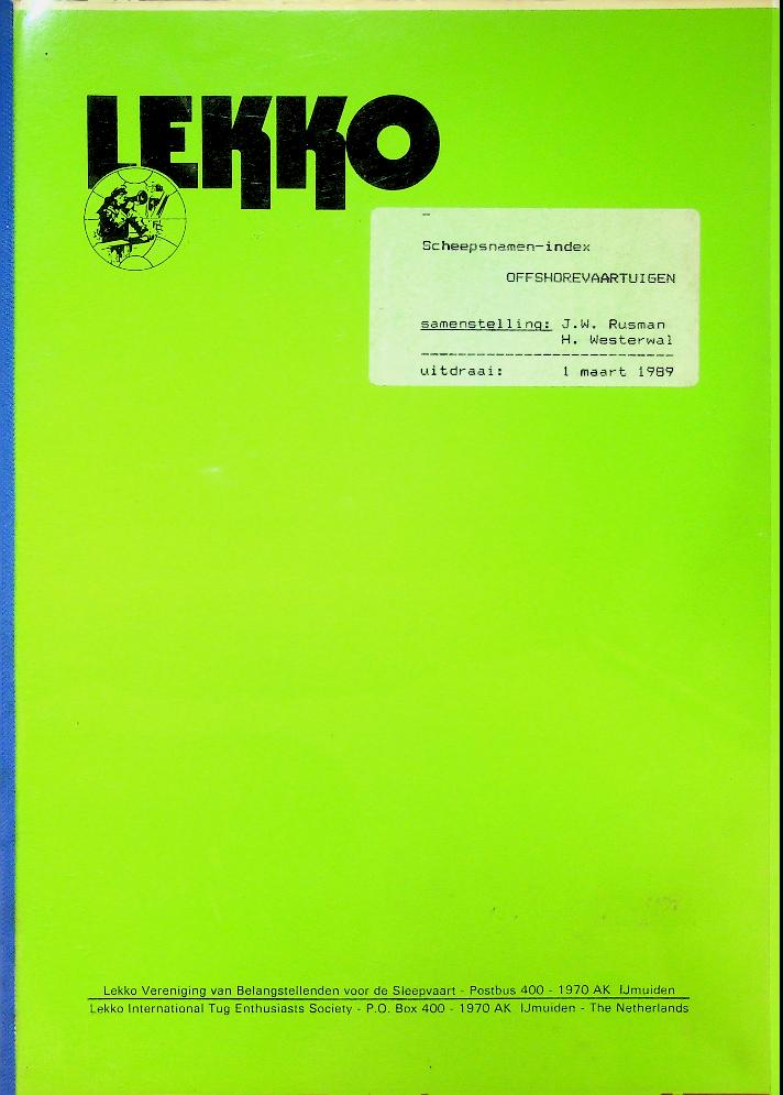 Rusman, J.W. Rusman en H. Westerwal: 1989 Lekko, softcover 120 blz.. Overzicht van offshore rederijen en hun schepen, met ex-namen na verkoop. In goede staat