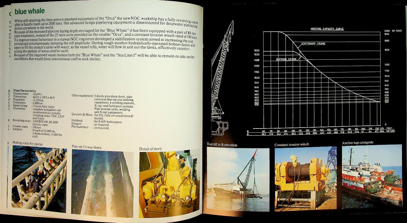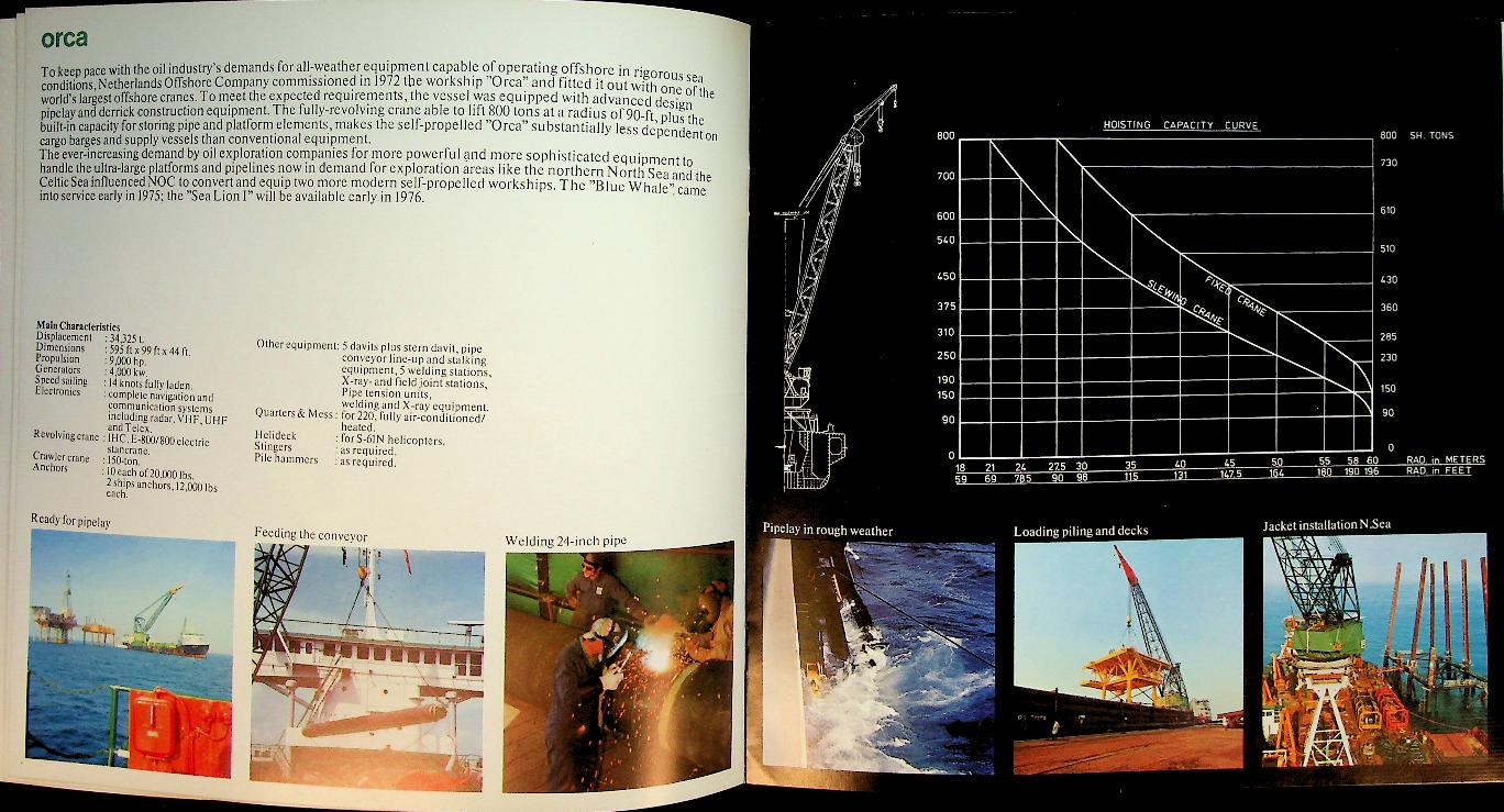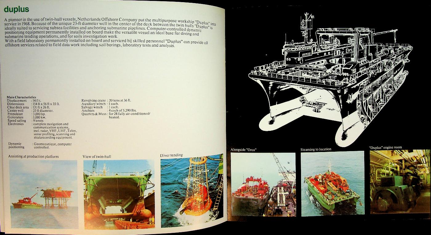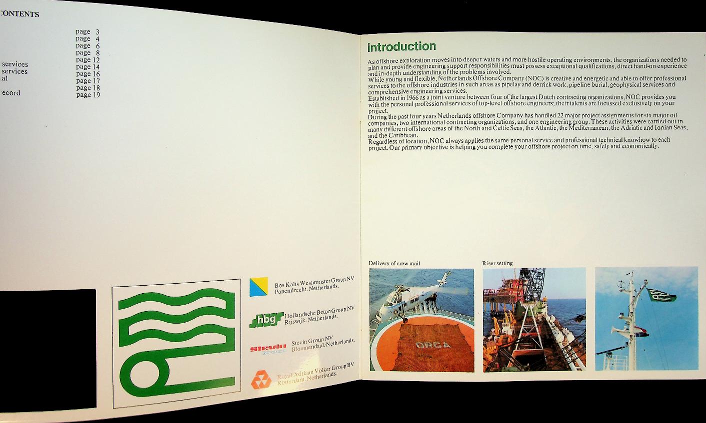 Netherland Offshore Company: Ca. 1975, softcover, 17 pages, illustrated. The Netherlands Offshore Company (NOC) was founded in 1966 by a group of major Dutch marine contractors.It focused on offshore construction for the emerging oil and gas industry in the North Sea. During the 1970s NOC built up a fleet of crane and pipe‑lay vessels such as Duplus, Orca, Blue Whale, Sea Lion I and Narwhal. These vessels enabled the installation of platforms and pipelines and strengthened the Dutch position in offshore engineering. In 1979 NOC’s assets were taken over by McDermott, ending its existence as an independent company. In very good condition