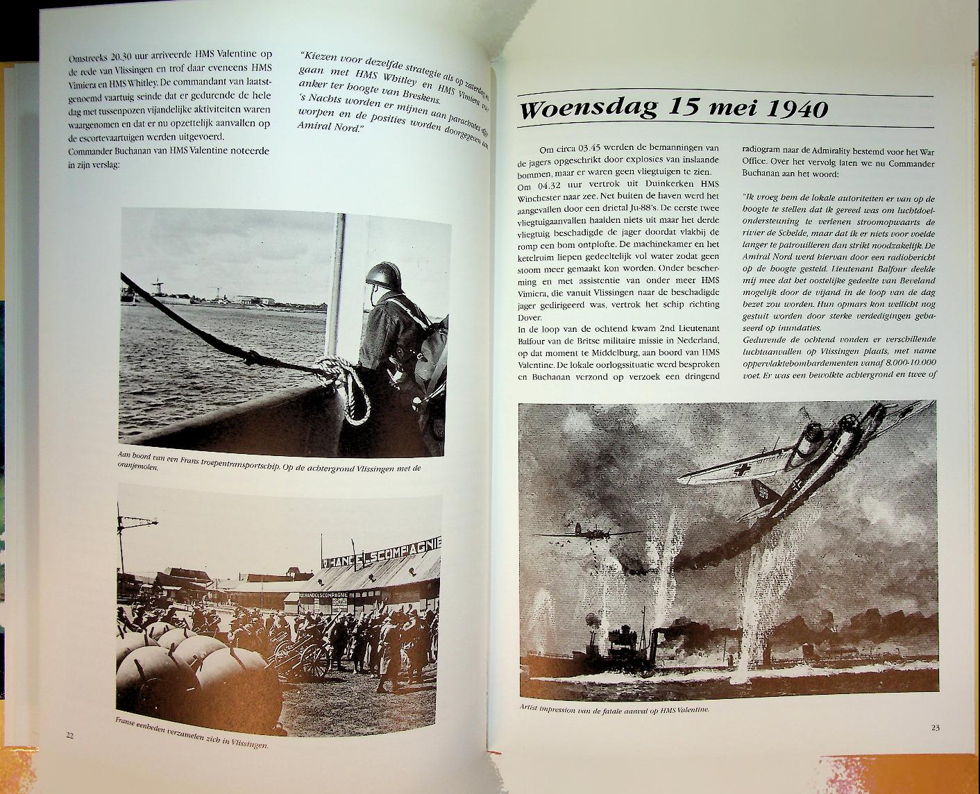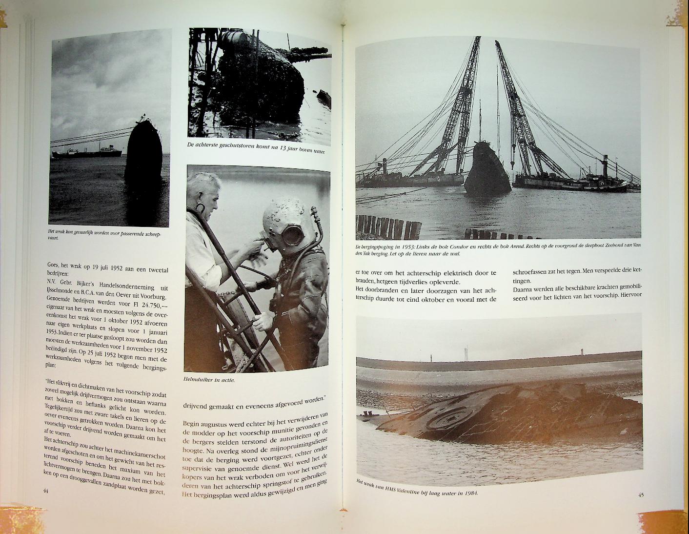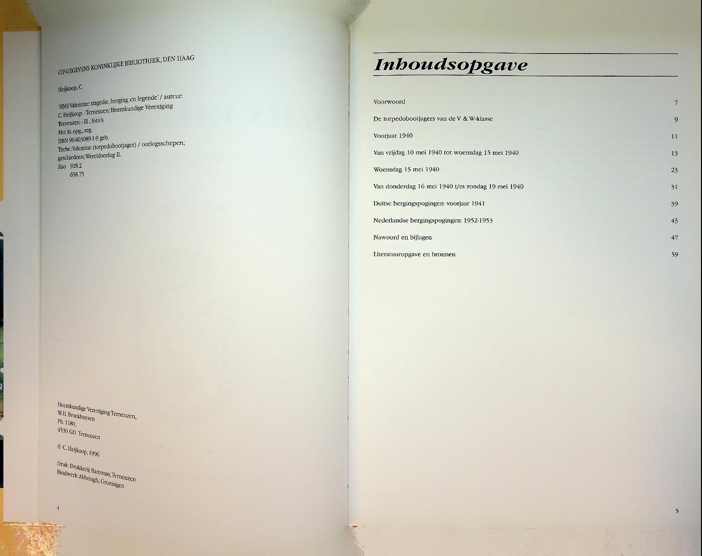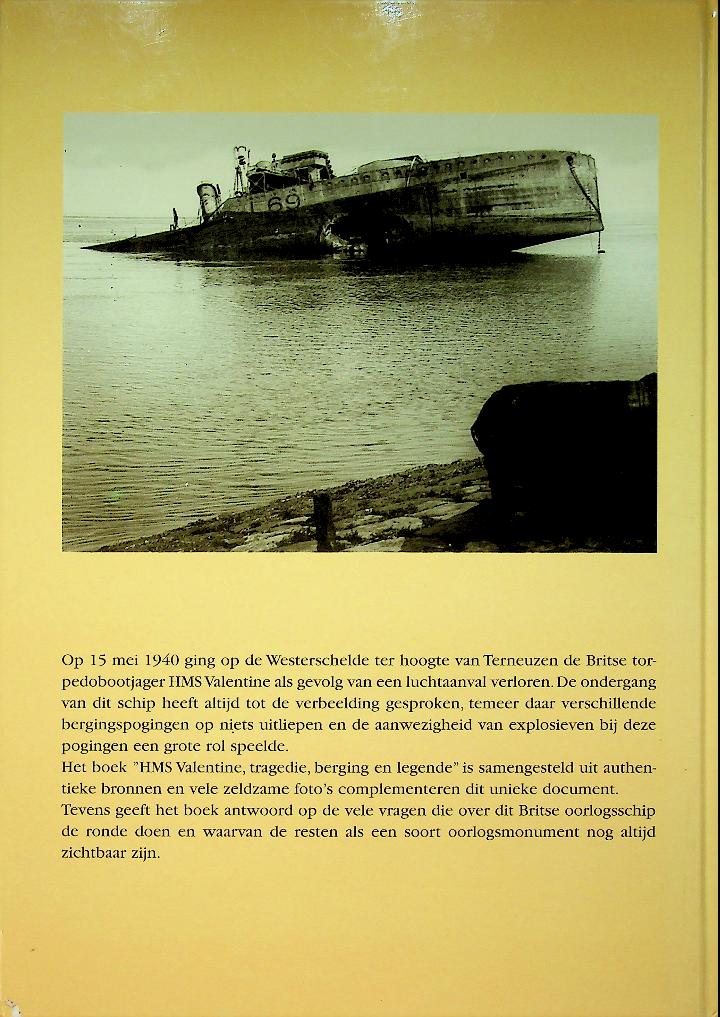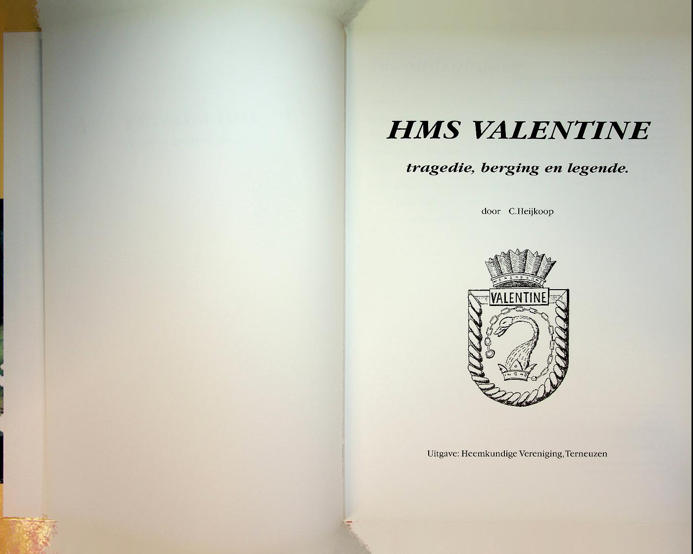 Heijkoop, C: 1996 Terneuzen, hardcover 72 blz.. HMS Valentine van C. Heijkoop beschrijft de ondergang van de Britse torpedobootjager HMS Valentine, die op 15 mei 1940 bij Terneuzen in de Westerschelde door een Duitse luchtaanval tot zinken werd gebracht, en de latere bergingspogingen van het wrak. Het boek verbindt feitelijke reconstructie van de militaire actie en de technische berging met de manier waarop het schip in de lokale herinnering en maritieme geschiedschrijving is uitgegroeid tot een legende.. ISBN 9789080308916 / 9080308919 In zeer goede staat