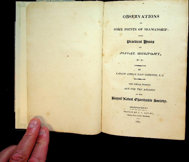 Griffiths, J.A.: 1824 Royal Naval Charitable Society Cheltenham, first edition. A practical 19th-century manual focusing on traditional seamanship skills essential for the age of sailing ships, offering clear instructions on ship handling, rigging, and navigation without the use of complex diagrams or mathematical tables. The book also includes advice on naval economy and the day-to-day management of a naval vessel, reflecting the professional knowledge expected of officers during the era of wooden warships. Its straightforward, hands-on approach made it a valued resource for sailors navigating the challenges of the open sea. In very good condition
