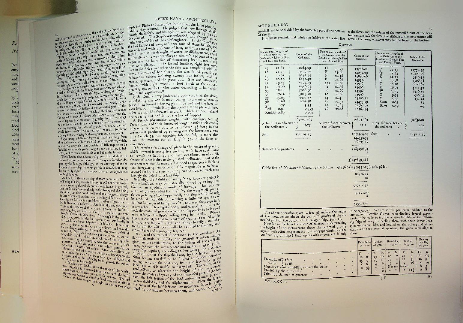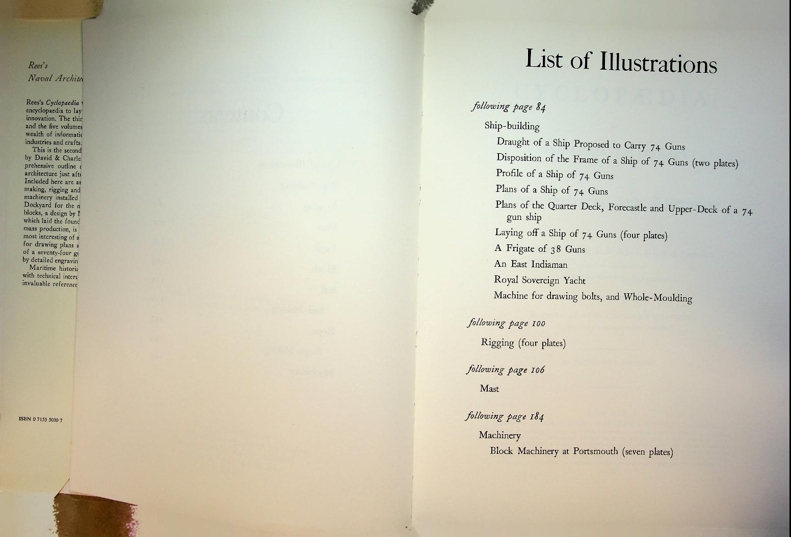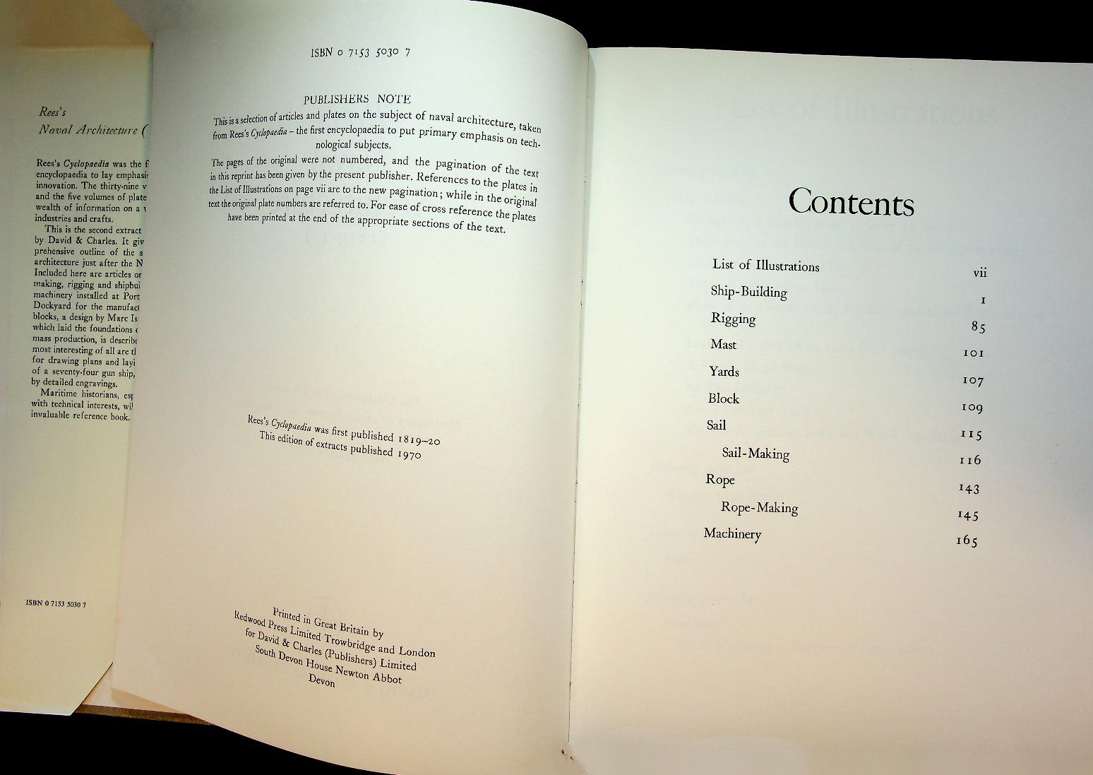 Rees, Abraham: 1970 UK, hardcover with dust jacket, 183 pages + folding-out Plates. Rees’s Naval Architecture (1819–20) is a facsimile selection from Abraham Rees’s monumental Cyclopaedia, presenting detailed early nineteenth‑century articles on shipbuilding, rigging, masts, sail‑making, and related aspects of naval architecture, accompanied by numerous technical plates and folding plans. The 1970 English reprint was issued in hardback by David & Charles. ISBN 9780870218606 / 0715350307 In very good condition