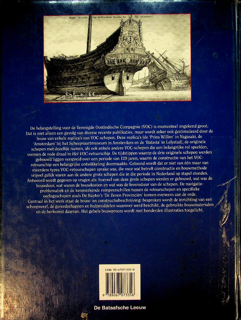 Kamer, H.N.: 1995, Amsterdam, hardcover 240 blz. Met vele gedetailleerde afbeeldingen. Het boek “Het VOC-retourschip” van H.N. Kamer biedt een rijk geïllustreerd overzicht van de bouw, inrichting en ontwikkeling van 17de- en 18de‑eeuwse VOC‑retourschepen, gepresenteerd als een panoramische gids voor Nederlandse scheepsbouw in die periode. Het behandelt in woord en beeld de constructiewijzen, indeling en technische keuzes van deze grote Oost-Indiëvaarders die voor heen- en terugreizen werden ontworpen, met nadruk op praktijkgerichte details voor scheepshistorici en modelbouwers. ISBN 9789067073356 In redelijke staat