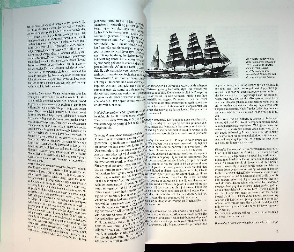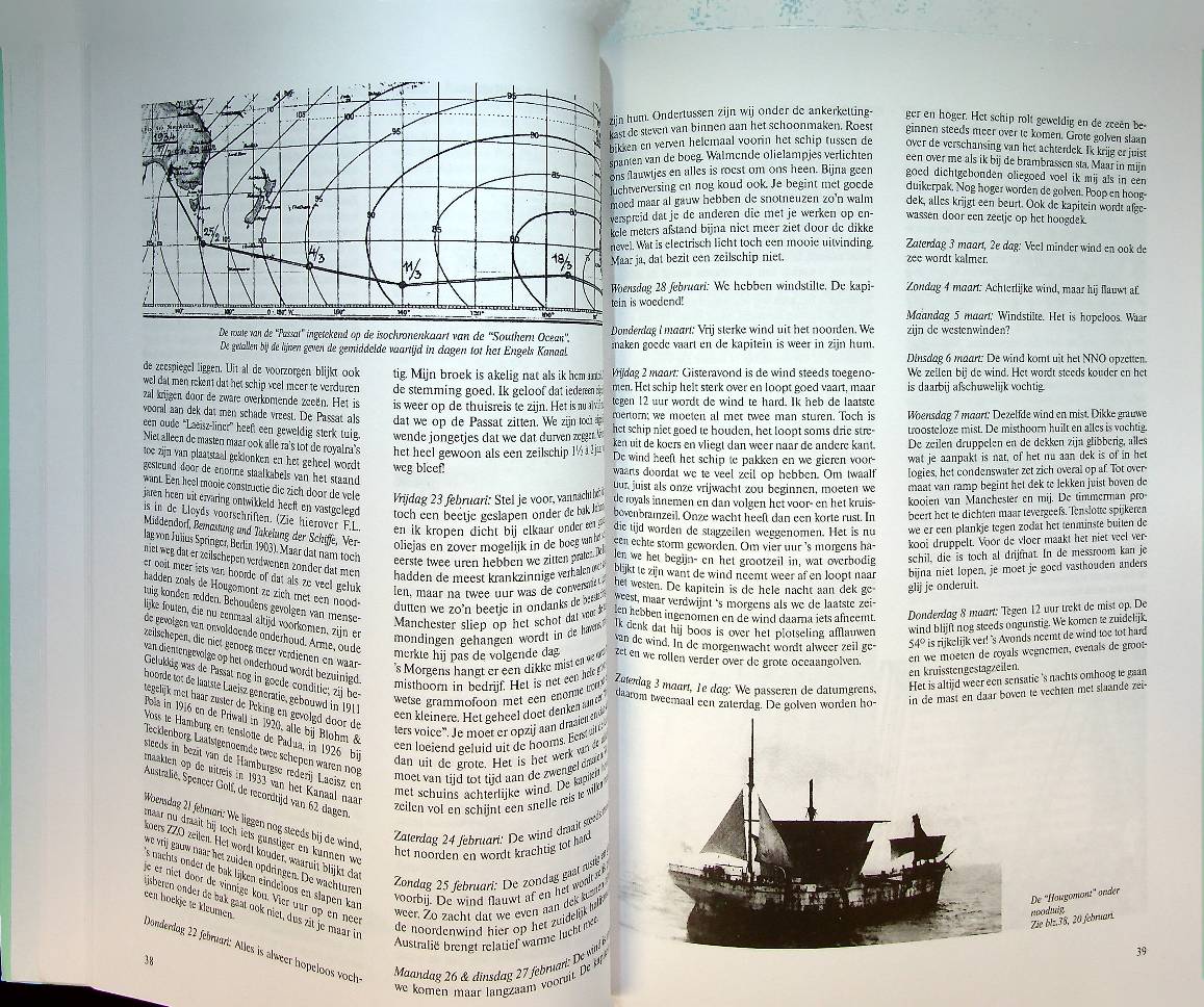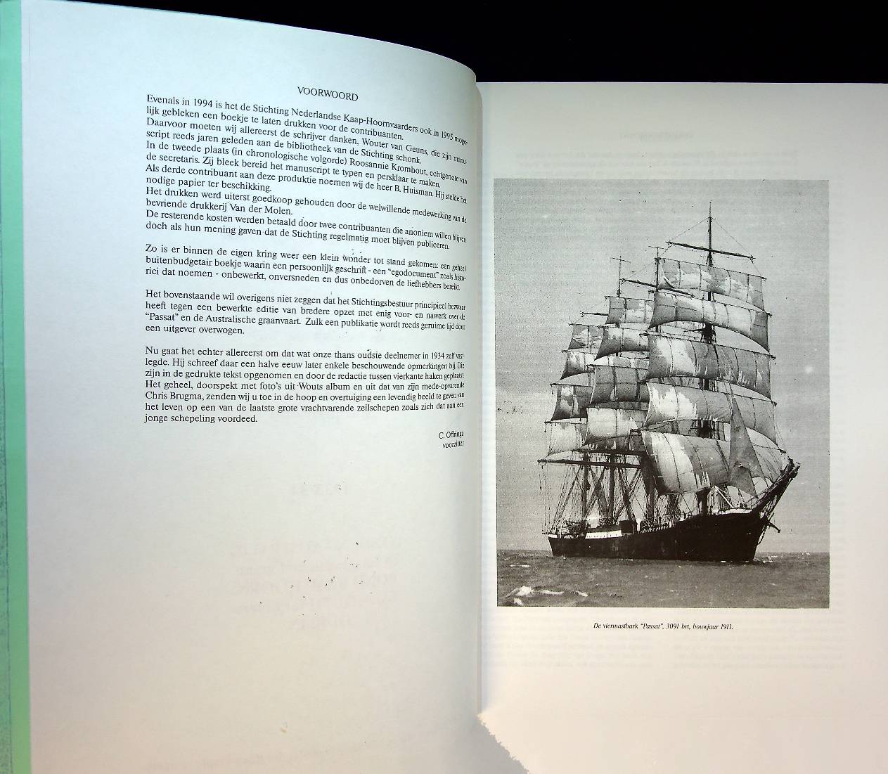 Geuns, W. van: 1990 Stichting Kaap Hoorn-Vaarders, softcover 51 blz., met foto's. “Een reis om de wereld met de viermastbark Passat” van W. van Geuns is een herinneringsverslag van zijn reis als leerling‑matroos op de beroemde Erikson‑windjammer Passat in 1933/34, met nuchtere observaties over opleiding, werkritme, zware zeilmanoeuvres en het leven aan boord tijdens een volledige wereldomzeiling. Het boek biedt historische context over de Passat als late windjammer en Flying P-Liner en vangt de overgangstijd tussen zeilende vrachtvaart en moderne scheepvaart, gezien door de ogen van een Nederlandse jongmaat op een Duitse viermastbark. In goede staat