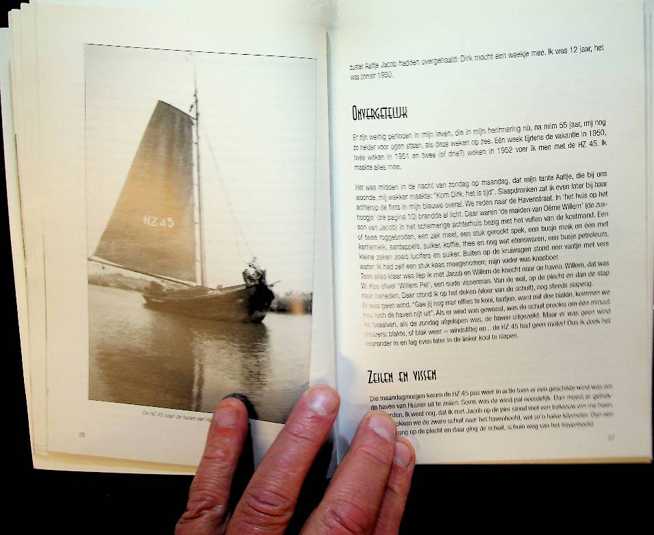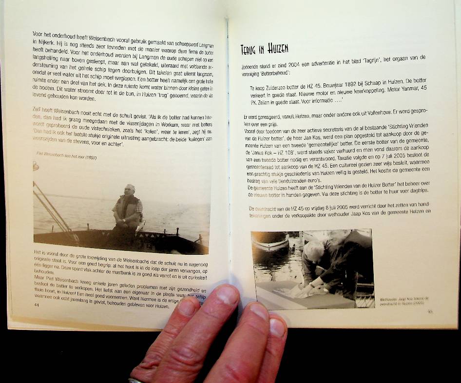 Schaap, D: 2008 Huizen, softcover, 52 blz., geïllustreerd. “De HZ 45 weer thuis” van Dick Schaap beschrijft de geschiedenis van de Huizer botter HZ 45, van haar visserijverleden tot het terugkeren in Huizen als varend monument en symbool van de plaatselijke maritieme traditie. Het boekje gaat in op de eigenaren, tochten en restauratie, en schetst daarmee ook de ontwikkeling van de Huizer vissersvloot en het behoud van het nautisch erfgoed. In zeer goede staat