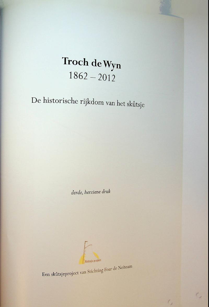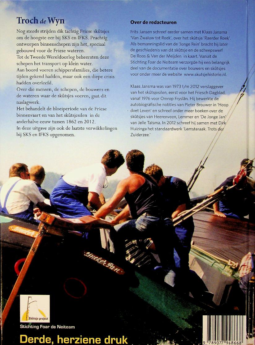 Jansen, F. en K. Jansma: 2012 Penn Leeuwarden, hardcover 578 blz.. 3e herziene druk. Over de schippers, de schepen, bouwers en de wateren. Troch de Wyn 1862-2012 beschrijft de historische rijkdom van het skûtsje en de wereld van skûtsjes en schippersfamilies, die zowel bloeitijd als diepe crises hebben meegemaakt. Het boek gaat in op de mensen, de schepen, de bouwers en de betekenis van deze Friese vrachtschepen voor de regionale maritieme cultuur in de periode 1862-2012. ISBN 9789077948668 In zeer goede staat. (because of weight, no sending outside Europe, or some additional costs)
